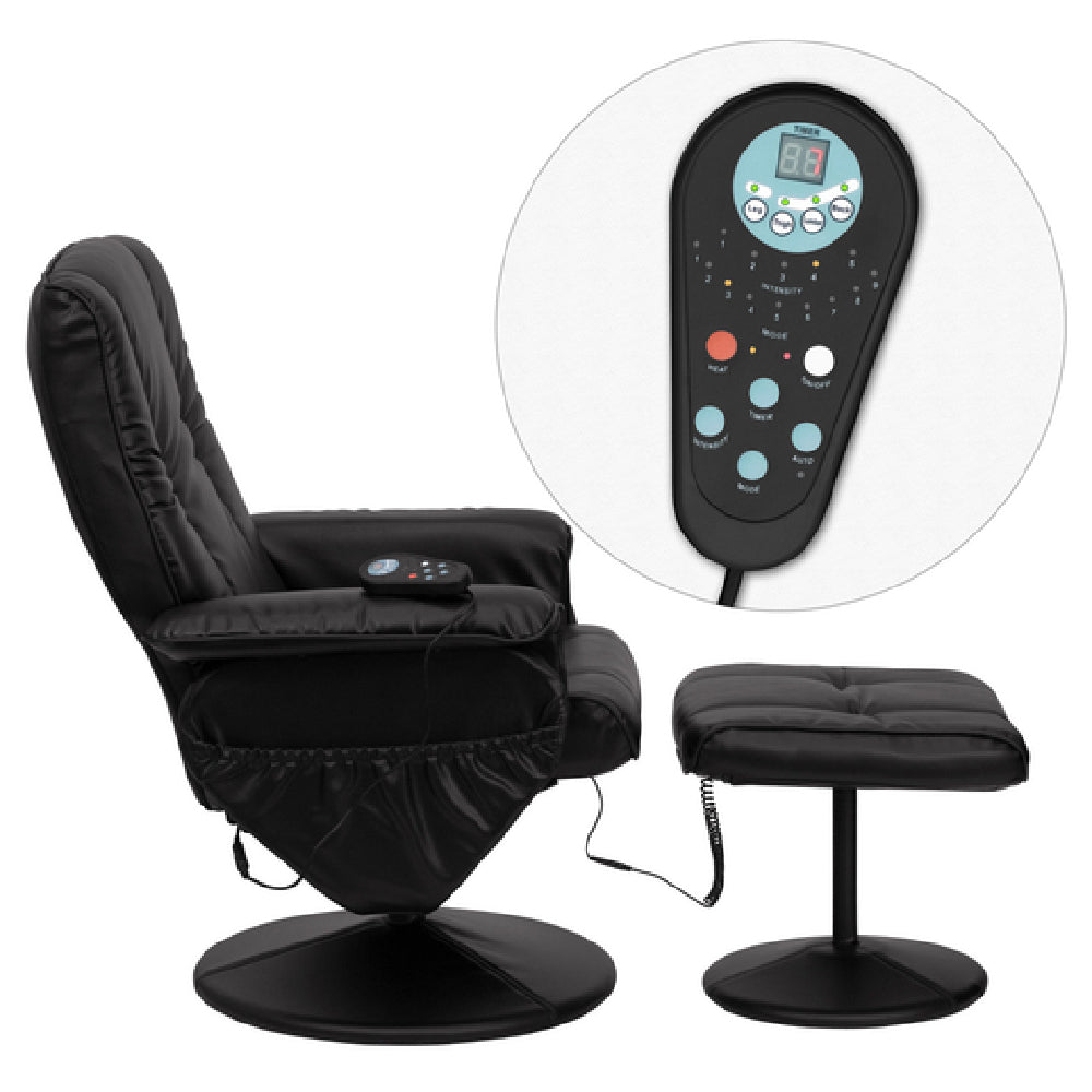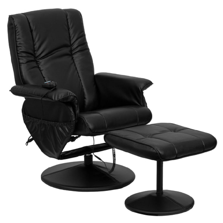 The Flash Furniture BT-7600P-MASSAGE-BK-GG Swivel Massaging Recliner is a versatile and innovative seating solution that combines ergonomic design with advanced massage technology. Measuring 30-3/4"W X 31"-43"D X 41"H, this recliner is upholstered with LeatherSoft material, ensuring durability and comfort. It features plush upholstered arms and a leather-wrapped base, providing a luxurious feel and aesthetic. The recliner is equipped with a 19"W x 19"D x 17"H ottoman, enhancing the relaxation experience. The massage function targets the back, lumbar, thighs, and legs, offering a comprehensive massage experience controlled via a remote with options for on/off, auto, timer, heat, nine massage modes, and five intensity levels. The recliner's CA117 fire retardant foam ensures safety, while the deep side pockets provide practical storage solutions. Designed to serve diverse market segments, this chair is ideal for home use, corporate environments, and wellness centers. The assembly is required, and in-stock items typically ship within 24 hours, making it a convenient option for those seeking immediate comfort and therapeutic benefits. The BT-7600P-MASSAGE-BK-GG is a sophisticated choice for those prioritizing both function and form in their seating arrangements.