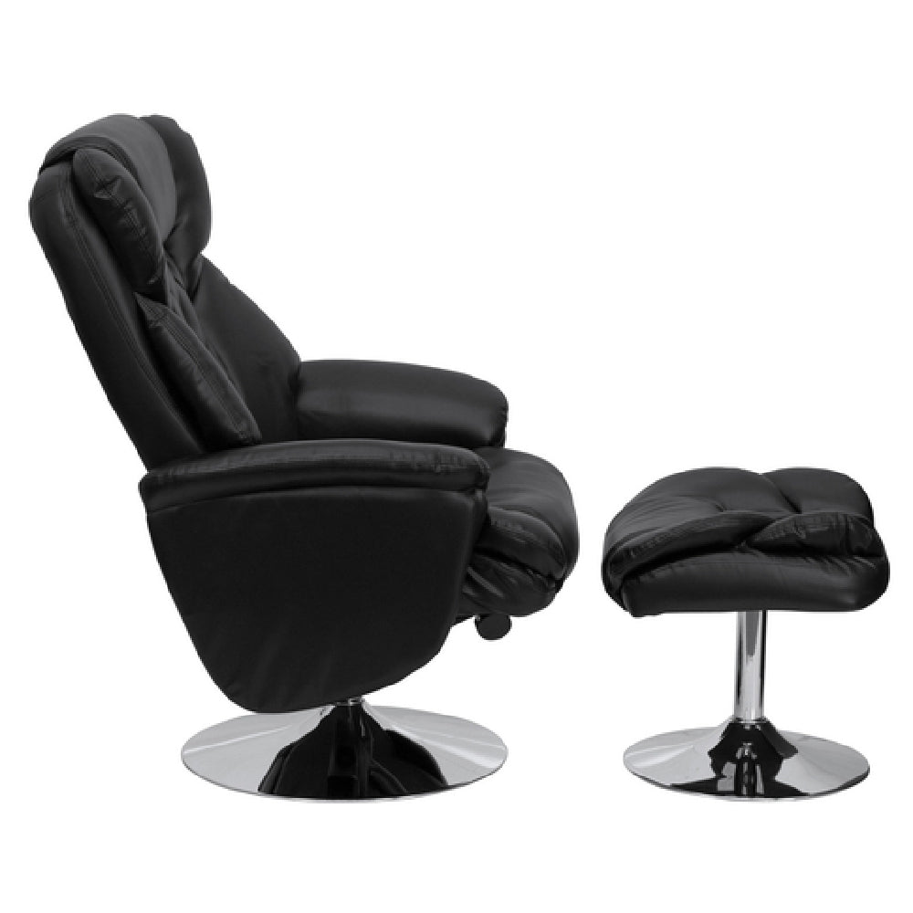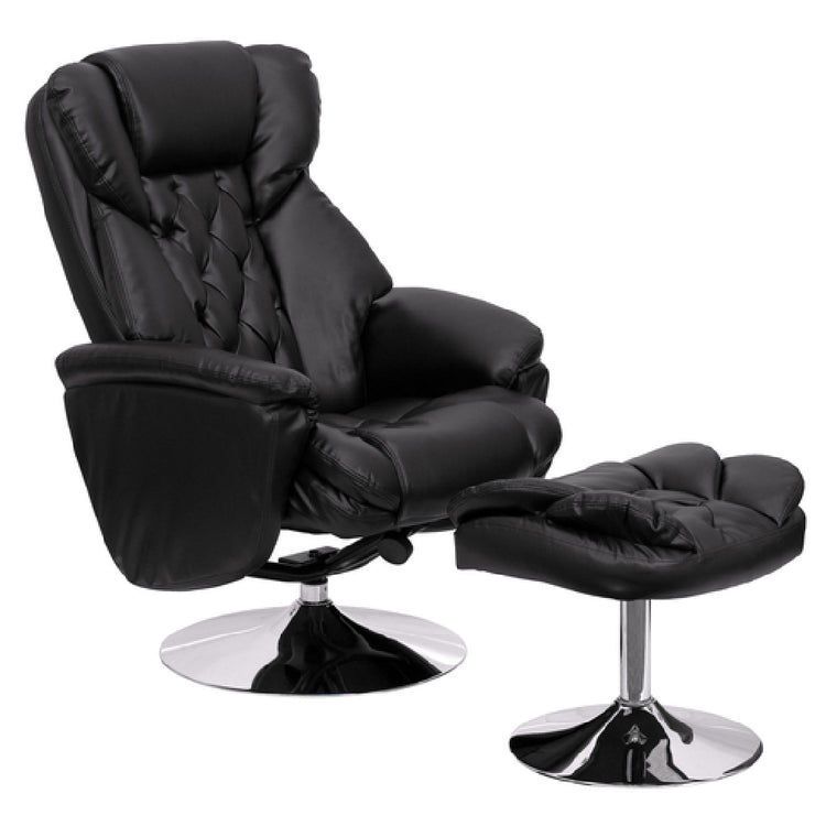 The Flash Furniture BT-7807-TRAD-GG Swivel Recliner 30"W x 35"-46"D x 41"H exemplifies the transitional style, seamlessly blending traditional and contemporary design elements. This recliner is notable for its upholstered button-tufted back and seat which provide a comfortable and visually appealing seating experience. An integrated headrest and plush upholstered arms enhance comfort, making it suitable for various market segments, from residential to commercial spaces such as lounges and waiting areas. The chrome base adds a modern touch, offering durability and stability. A unique knob-adjusting feature allows for personalized reclining angles, catering to individual comfort preferences. The product comes complete with a 19"W x 18-1/2"D x 17"H ottoman, perfect for added relaxation. Safety and quality are prioritized with the use of CA117 fire-retardant foam, while the LeatherSoft material—a blend of leather and polyurethane—ensures soft, supple seating. Black in color, this recliner requires assembly, and its stock items are typically shipped within 24 hours, making it a convenient choice for quick setup needs. The Flash Furniture BT-7807-TRAD-GG Swivel Recliner is a versatile addition to any setting, offering an appealing combination of style, comfort, and functionality.