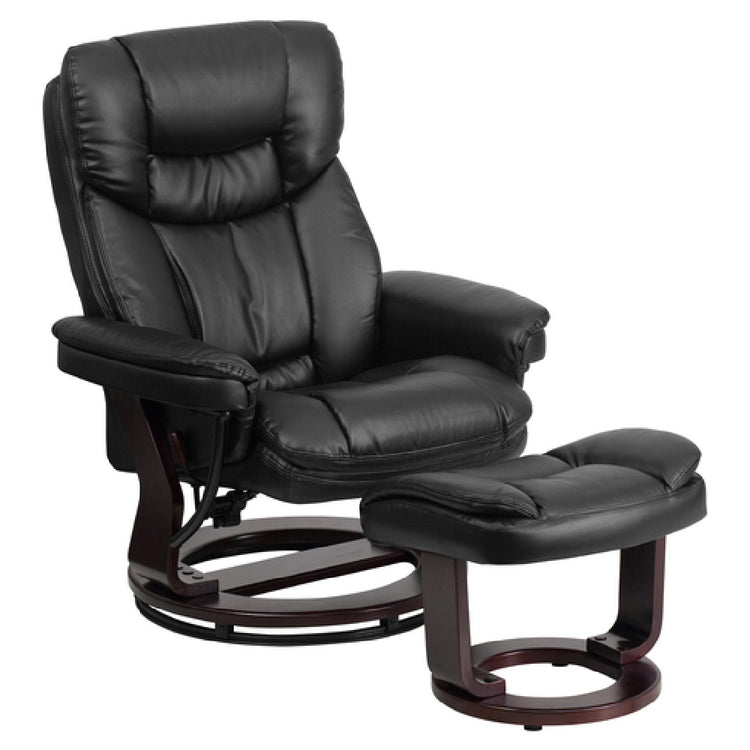 The Flash Furniture BT-7821-BK-GG Swivel Recliner is a contemporary-style seating solution with dimensions of 33"W x 34"-44-1/2"D x 41-1/4"H, designed to cater to diverse market segments in the furniture industry. This recliner features an upholstered back and seat with an integrated headrest, ensuring maximum comfort. Its plush arms complement the wood base, which boasts an elegant mahogany finish. The product includes an adjusting lever for personalized reclining options and a ball-bearing swiveling base that enhances mobility and ease of use. Accompanying the recliner is a 19-3/4"W x 18"D x 16-1/4"H ottoman, providing additional comfort and support. The recliner is made with LeatherSoft material in black, offering both durability and a sleek appearance. Safety and quality are prioritized with the inclusion of CA117 fire retardant foam. Additionally, the floor glides ensure stability and protect flooring surfaces. Assembly is required for this product, which is readily available and typically ships within 24 hours of order placement. This swivel recliner is an exemplary choice for those seeking a blend of style, comfort, and functionality in their living or office spaces.