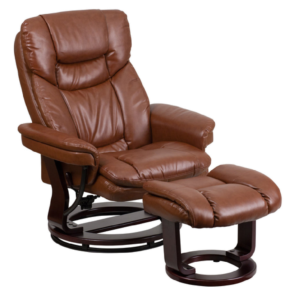 The Flash Furniture BT-7821-VIN-GG Swivel Recliner, with dimensions of 33"W x 34" - 44-1/2"D x 41-1/4"H, is a contemporary-style seating solution designed for both comfort and functionality. Upholstered with a LeatherSoft material in a vintage brown finish, the recliner features plush arms and an integrated headrest that provide exceptional support. The chair's ball-bearing swiveling base and an adjusting lever allow for smooth rotational movement, complementing its ergonomic design. The wood base, finished in mahogany, adds an elegant touch to its overall aesthetic. Included with the recliner is an ottoman measuring 19-3/4"W x 18"D x 16-1/4"H, offering additional comfort and convenience. The set is equipped with floor glides to protect your flooring surfaces, while the CA117 fire retardant foam ensures safety. Assembly is required, and in-stock items typically ship within 24 hours, making this recliner a practical and stylish addition to any living space. Its robust construction and versatile design make it suitable for various market segments, including residential and office environments, where comfort and style are paramount.