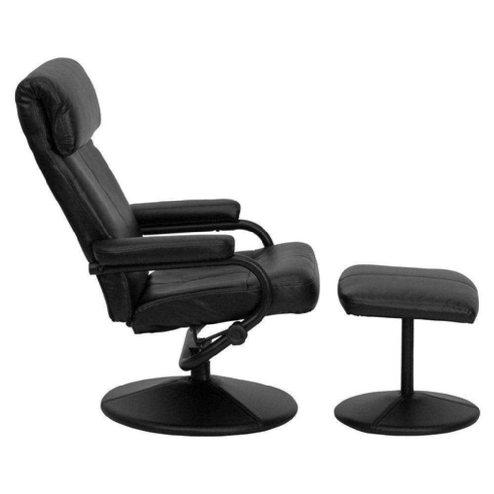 The Flash Furniture BT-7863-BK-GG Swivel Recliner measures 26-1/2"W x 31" - 41"D x 38"H and features a contemporary style, ideal for both modern home environments and professional office spaces. With a focus on comfort and design, this recliner includes a pillow top headrest and plush upholstered arms for added support. The seat and back are upholstered, providing an enhanced seating experience. Its leather-wrapped base and knob-adjusting mechanism offer smooth swivel and reclining functions, making it a versatile piece for relaxation or work settings. Included is a matching ottoman measuring 17-1/4"W x 15-1/2"D x 15-1/2"H, enhancing the recliner’s functionality and comfort. Constructed with CA117 fire retardant foam, safety is a priority. The use of LeatherSoft, a blend of leather and polyurethane, increases both durability and softness. Available in black, this recliner requires assembly and is typically ready for shipment within 24 hours for in-stock items. The Flash Furniture BT-7863-BK-GG Swivel Recliner is a sophisticated choice for those seeking a balance of style, comfort, and functionality, catering to diverse market segments, including residential and commercial applications, with its adaptable and luxurious design elements.