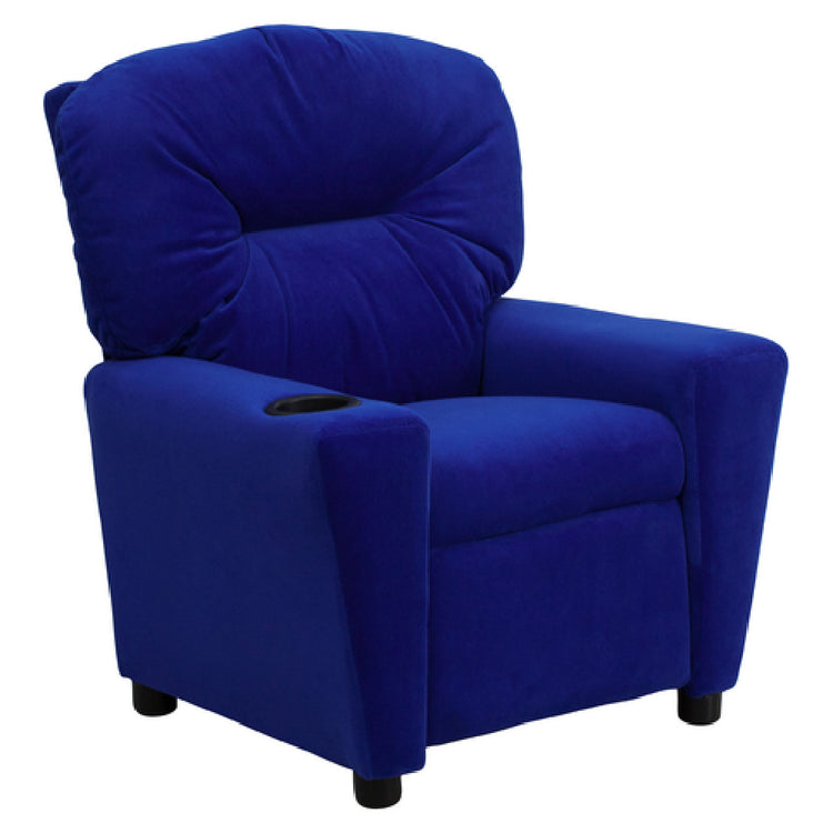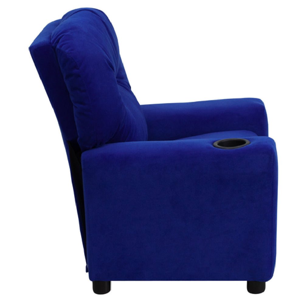 The Flash Furniture BT-7950-KID-MIC-BLUE-GG Kids Recliner is a contemporary-style seating solution designed specifically for children, combining comfort and safety. With dimensions of 24-1/2"W x 25" - 39"D x 28"H, this recliner offers a compact yet spacious seating experience tailored for young users. Upholstered in a vibrant blue microfiber, it features plush padding for enhanced comfort, and comes equipped with armrests and a convenient cup holder, supporting both relaxation and functionality. Engineered with a solid hardwood frame and raised black plastic feet, it assures stability and durability. The recliner incorporates a safety feature, preventing it from reclining unless the child is seated and the ottoman is pulled 1" out, ensuring safe usage. It has a weight limit of 90 lbs, making it suitable for a range of young children. The inclusion of CA117 fire retardant foam highlights its commitment to safety standards. Although assembly is required, in-stock items typically ship within 24 hours, ensuring quick delivery. The Flash Furniture BT-7950-KID-MIC-BLUE-GG is an ideal choice for parents and caregivers seeking a safe, comfortable, and stylish seating option for children's playrooms, bedrooms, or family living spaces.