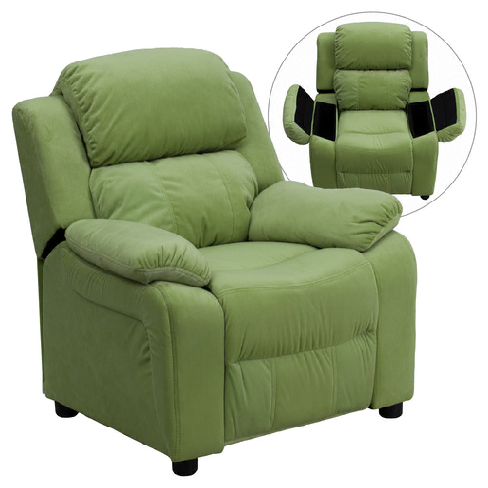 The Flash Furniture BT-7985-KID-MIC-AVO-GG Kids Recliner 25"W X 26"- 39"D X 28"H Contemporary Style is a versatile seating solution designed specifically for children, blending functionality with comfort. This kids recliner measures 25 inches in width, with a depth ranging from 26 to 39 inches, and stands at 28 inches high. It features an upholstered back and seat, providing a plush seating experience with deluxe padding. Equipped with a headrest cover and flip-up storage arms, it combines comfort with practicality. The chair is built on a solid hardwood frame and is supported by raised black plastic feet, ensuring stability and durability. Safety is a key consideration, as the recliner will not recline unless the child is seated and pulls the ottoman out by 1 inch, accommodating a weight limit of up to 90 pounds. The recliner is made with CA117 fire retardant foam and microfiber in an attractive avocado color. Assembly is required, and in-stock items generally ship within 24 hours. This product is ideal for families seeking a stylish and safe seating option for children, with features that suit various needs and preferences within the children's furniture market.
