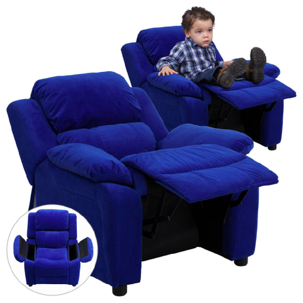 The Flash Furniture BT-7985-KID-MIC-BLUE-GG Kids Recliner is a contemporary style seating option, perfectly crafted for children's comfort and safety. Measuring 25 inches wide and 26 to 39 inches deep, with a height of 28 inches, this recliner is designed to accommodate the unique needs of younger users. Upholstered with plush padding and a microfiber cover, it ensures a cozy and soft seating experience. The recliner features a headrest cover and flip-up storage arms, adding versatile functionality. Its solid hardwood frame provides durability, while raised black plastic feet offer stability. The recliner includes a safety mechanism that prevents reclining unless the child is seated and has pulled the ottoman out by an inch, ensuring secure use. Supported by CA117 fire retardant foam, it meets safety standards for peace of mind. Designed to support up to 90 pounds, this recliner is ideal for various environments, from home settings to children's recreational spaces. Assembly is required, and in-stock items are typically shipped within 24 hours, making it a convenient choice for those seeking a reliable, stylish, and safe seating solution for children.