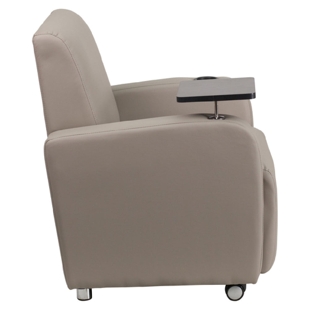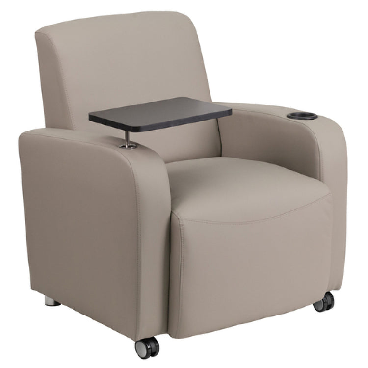 Flash Furniture BT-8217-GV-CS-GG Guest Chair is designed with a taut seat and back, offering both comfort and durability, ideal for various professional environments. The chair is upholstered in LeatherSoft, a blend of leather and polyurethane, providing a smooth and soft feel while ensuring longevity. The plush foam seat, which incorporates CA117 fire retardant foam, adds an extra layer of safety and comfort. This chair features a 13-3/4"W x 10"D black tablet arm that swings 360°, providing a versatile work surface for meetings or presentations. Additionally, the left arm includes a built-in cup holder, enhancing convenience for users. For mobility, this guest chair is equipped with front wheel casters and chrome feet, allowing easy movement and stability. The inclusion of plastic floor glides protects flooring surfaces from scratches. Presented in a stylish gray finish, this guest chair requires assembly upon delivery. Available for quick shipping, in-stock items usually ship within 24 hours, making it a practical choice for offices, conference rooms, or reception areas that demand functionality combined with modern aesthetics.