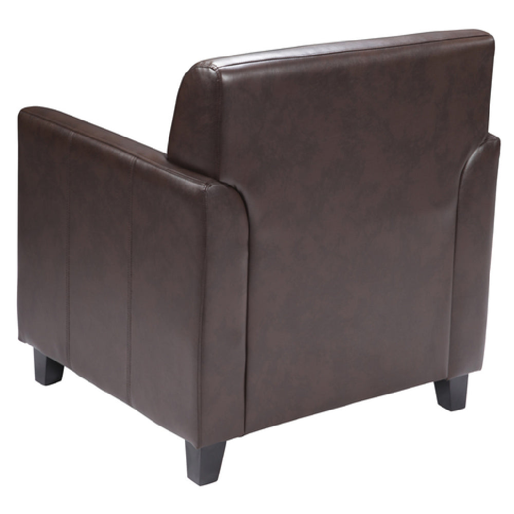 The Flash Furniture BT-827-1-BN-GG Hercules Diplomat Series Reception Chair is an expertly crafted seating solution, featuring LeatherSoft upholstery that combines the durability of leather with the softness of polyurethane. This chair is designed with flared arms, providing a sophisticated look and offering comfort for prolonged sitting sessions. The plush seat and back deliver an inviting and relaxed seating experience, while the fixed seat and back cushions ensure stability and consistent support. Its construction includes CA117 fire retardant foam, ensuring safety in public settings. The chair's sturdy hardwood construction guarantees longevity and resilience, complemented by black wood feet that add an elegant touch. Finished in a rich brown color, this chair is versatile enough to fit various interior aesthetics. It is particularly suitable for reception areas, executive offices, and hospitality settings, where style and comfort are paramount. Assembly is required, making it a practical choice for businesses that need adaptable and easily transportable furniture. The chair's availability for quick shipping—usually within 24 hours—ensures that it meets the urgent needs of fast-paced environments. The Flash Furniture Hercules Diplomat Series Reception Chair combines aesthetics, comfort, and safety, making it an ideal choice for diverse professional settings.