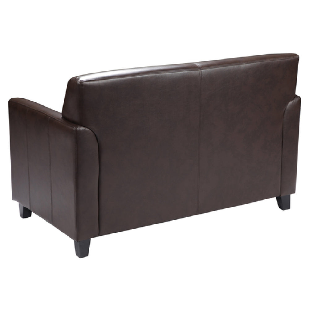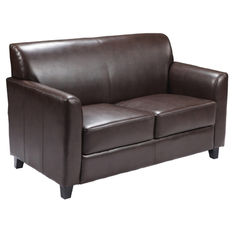 The Flash Furniture BT-827-2-BN-GG Hercules Diplomat Series Reception Loveseat is a meticulously crafted seating solution designed to elevate any reception area. With dimensions of 52"W x 29"D x 32-1/4"H, this loveseat provides ample seating space while maintaining a compact footprint. It features LeatherSoft upholstery, a blend of leather and polyurethane, offering both durability and comfort. The loveseat is designed with elegant flared arms and plush seat and back, enhancing its aesthetic appeal and providing superior comfort. The fixed seat and back cushions ensure a neat appearance and consistent comfort levels. It is constructed using CA117 fire retardant foam, meeting safety standards without compromising on comfort. The loveseat’s sturdy hardwood construction ensures long-lasting durability, supported by black wood feet that add a touch of sophistication. Available in a classic brown color, this loveseat requires assembly upon delivery. It is an ideal choice for businesses seeking a stylish and durable seating option for their reception areas. In terms of logistics, in-stock items typically ship within 24 hours, providing a quick turnaround for businesses needing to furnish their spaces promptly. This loveseat serves as an excellent investment for industries focusing on both aesthetics and practicality in their reception environments.