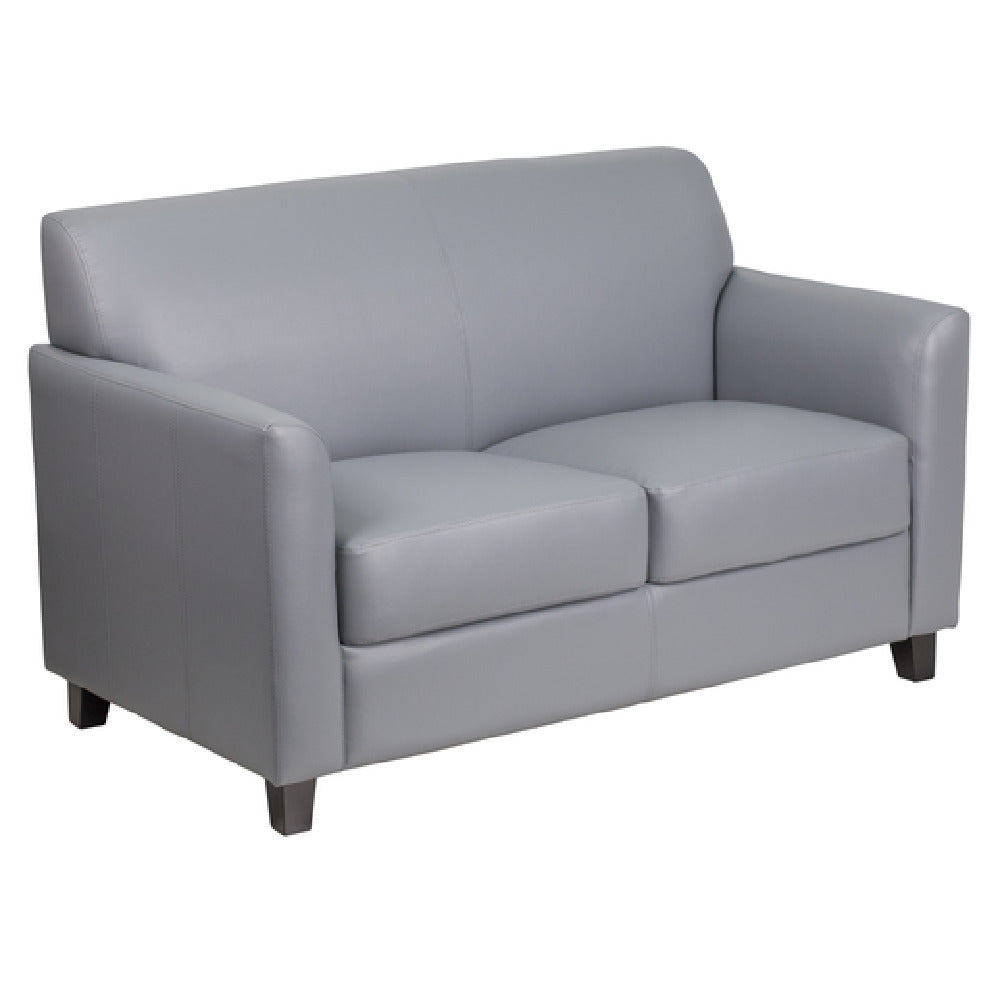 The Flash Furniture BT-827-2-GY-GG Hercules Diplomat Series Reception Loveseat is a sophisticated and durable seating solution, ideal for various professional environments. This loveseat measures 52 inches in width, 29 inches in depth, and 32-1/4 inches in height, making it a perfect fit for reception areas that require a blend of style and comfort. It features LeatherSoft upholstery, a material that combines leather and polyurethane for added softness and durability. The loveseat is designed with flared arms and plush fixed seat and back cushions, providing both comfort and a contemporary aesthetic. Constructed with CA117 fire retardant foam, it ensures safety without compromising on comfort. The sturdy hardwood construction enhances its longevity, while the black wood feet add a touch of elegance. Its gray color allows it to blend seamlessly into various decor settings. Assembly is required upon delivery, and in-stock items typically ship within 24 hours. This product is particularly valuable for industries ranging from corporate offices to hospitality settings, where both style and resilience are key. Its dimensions and features make it a versatile choice for creating inviting reception and waiting areas.