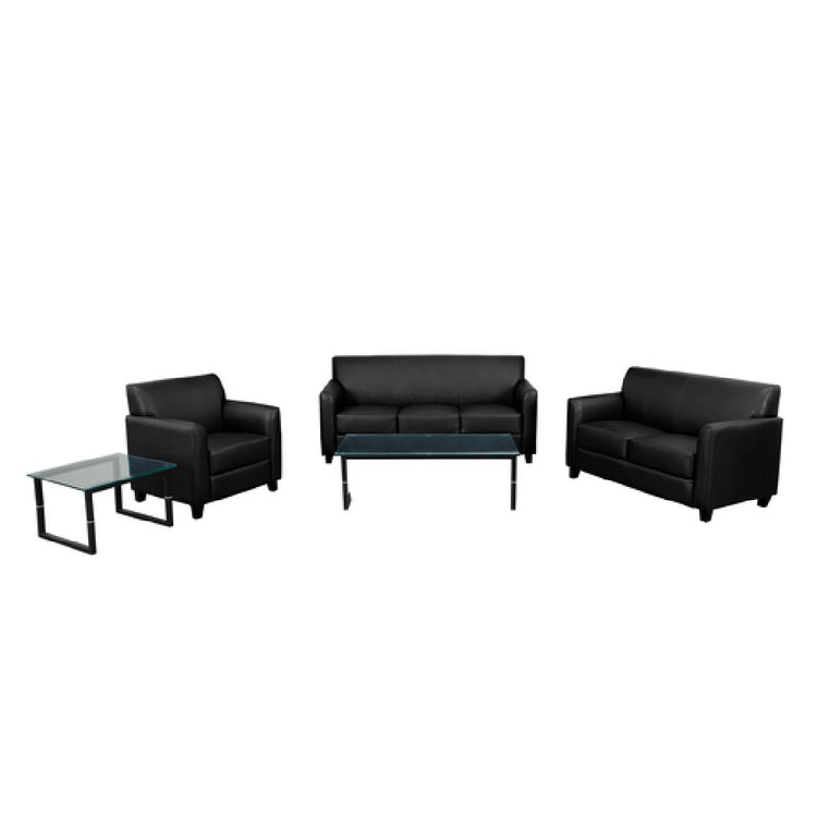Flash Furniture BT-827-SET-BK-GG Hercules Diplomat Series Reception Set offers a comprehensive seating solution designed to enhance any reception area with its upscale appearance and robust construction. This set includes three essential components: a chair measuring 30-1/2"W x 29"D x 32-1/2"H, a loveseat at 52"W x 29"D x 32-1/4"H, and a sofa spanning 70"W x 29"D x 32-1/4"H. Each piece is upholstered in LeatherSoft, a blend that combines leather and polyurethane for added softness and durability. The set features flared arms and plush seat and back cushions that provide comfort and support, with the cushions being fixed to ensure longevity and maintain a neat appearance. Built with sturdy hardwood construction and enhanced by black wood feet, this reception set ensures stability and style. It also incorporates CA117 fire retardant foam, prioritizing safety in public spaces. Shipped in three boxes, this reception set is typically available for dispatch within 24 hours, catering to businesses that require quick and reliable furnishing solutions. Ideal for various markets, including corporate offices, medical waiting rooms, and hospitality lounges, the Hercules Diplomat Series combines aesthetic appeal with practical function, making it a valuable addition to any professional setting.