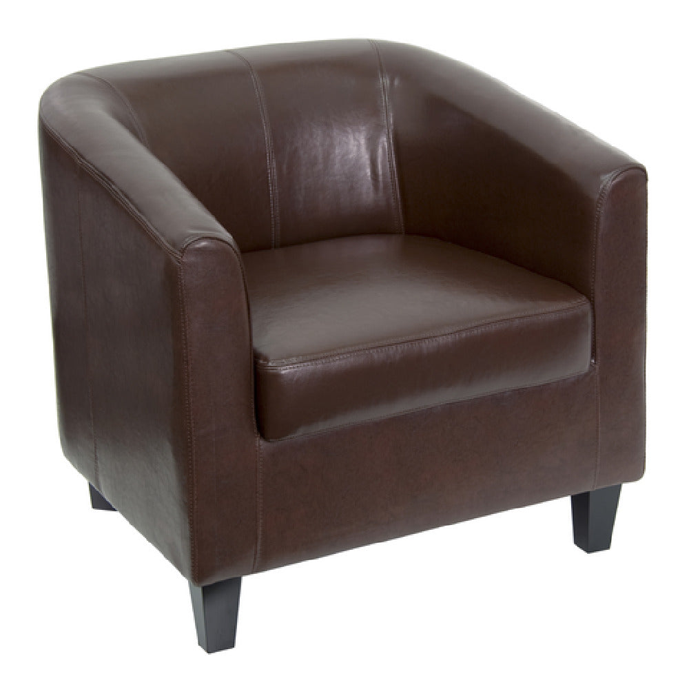The Flash Furniture BT-873-BN-GG Office Guest/Reception Chair is engineered with a 250 lb weight capacity, making it a reliable choice for various professional environments. This chair features sloping arms and a barrel back design that accentuates its stylish aesthetic while providing ergonomic support. The LeatherSoft upholstery, a blend of leather and polyurethane, offers a supple and durable seating surface. Tailored stitching on the upholstery enhances its sophisticated appearance. The fixed seat cushion is constructed with dense foam padding for added comfort during extended use, while the CA117 fire retardant foam ensures safety compliance. Built with a solid inner hardwood frame, this chair promises durability and long-term performance. The black wood legs offer sturdy support and complement the warm brown upholstery, adding a touch of elegance to any office or reception area. Assembly is required, but in-stock items typically ship within 24 hours, providing a quick and efficient solution for furnishing corporate spaces. The Flash Furniture BT-873-BN-GG chair is an ideal choice for businesses seeking a blend of style, comfort, and safety in their office seating arrangements.