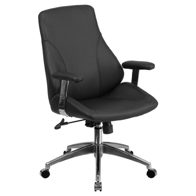 The Flash Furniture BT-90068M-GG Executive Swivel Office Chair is designed for those who prioritize comfort and functionality in their workspace. Featuring an adjustable height range of 40-1/2 inches to 44-1/4 inches, this chair caters to a variety of desk heights and user preferences. Its mid-back design and LeatherSoft upholstery provide a blend of comfort and durability, suitable for extended periods of use. The chair is equipped with built-in lumbar support, promoting ergonomic health for professionals and executives who spend long hours seated. It includes a 2-to-1 locking Synchro tilt adjustment and a tilt tension adjustment knob, allowing users to customize their seating position for optimal comfort. Chrome padded arms add a touch of sophistication, while the CA117 fire retardant foam ensures safety. The heavy-duty aluminum base and dual wheel casters offer stability and smooth mobility, supporting up to 250 pounds. This executive chair is an ideal choice for office environments that demand both style and robust performance, with assembly required and in-stock items typically shipping within 24 hours. It is a versatile seating solution for corporate offices, home workspaces, and professional environments seeking a balance of elegance and utility.