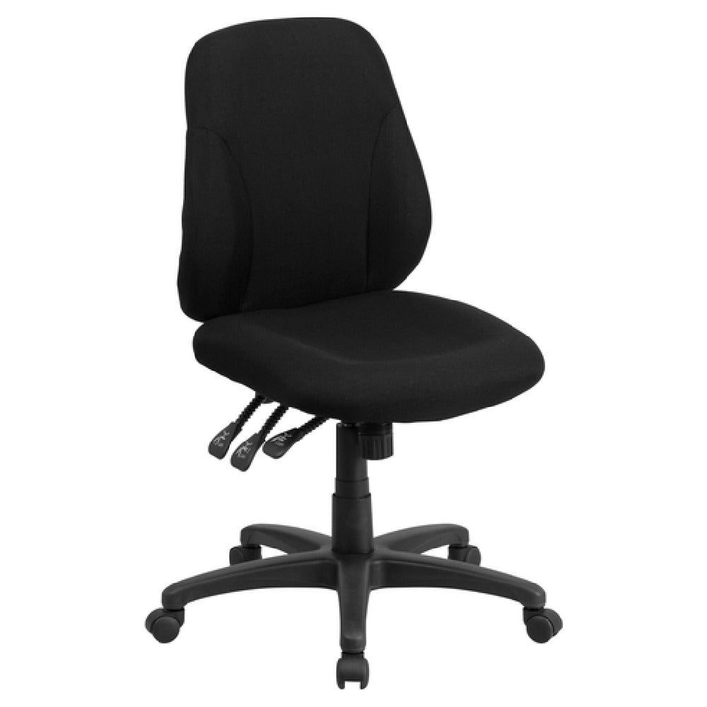 The Flash Furniture BT-90297S-GG Ergonomic Swivel Task Chair 37-1/2" to 43" Adjustable Height is a versatile seating solution designed for various professional environments. This chair features a mid-back design, offering essential support for extended periods of sitting. With a weight capacity of 250 lb., it accommodates a wide range of users, making it suitable for office settings. The chair's adjustable height ranges from 37-1/2" to 43", ensuring optimal ergonomics for different workspace configurations. Its multi-functional capabilities are highlighted by the triple paddle control mechanism, which allows for precise adjustments including the infinite-locking back angle adjustment. The waterfall seat design, combined with polyester upholstery, enhances user comfort. Built-in lumbar support further contributes to maintaining a healthy posture. The chair's 1-3/4" adjustable height and multi-tilt lock mechanism provide additional customization for varied tasks. Constructed with CA117 fire retardant foam and a heavy-duty black nylon base, this chair balances safety with durability. Equipped with dual wheel casters, it offers easy mobility across different surfaces. Notably, the chair is designed without arms, catering to those who prefer unobstructed movement. The Flash Furniture BT-90297S-GG is available in stock, with most items shipping within 24 hours, ensuring prompt delivery for immediate use.
