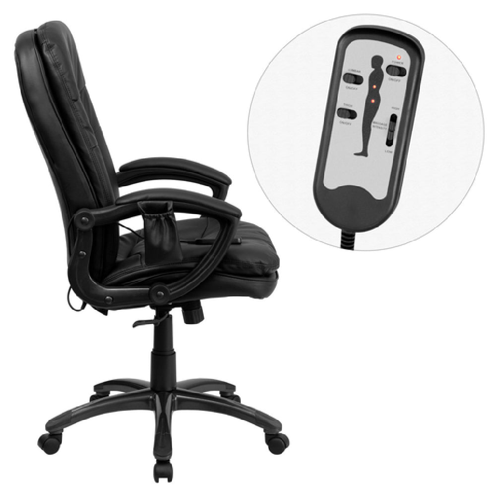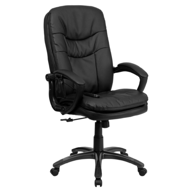 The Flash Furniture BT-9585P-GG Massaging Executive Swivel Office Chair 44-1/2" to 48" Adjustable Height is engineered for comfort and functionality, making it a standout choice in office seating solutions. This chair supports a weight capacity of 250 lb. and features a high back design, complemented by a contoured seat and back for ergonomic support. Upholstered in LeatherSoft, it combines the softness of leather with added durability. The built-in massaging functions, controlled via a side pocket remote, include power on/off control and targeted lumbar and thigh on/off control, with variable intensity levels to suit different preferences. The chair further enhances comfort with its built-in lumbar support, tilt lock mechanism, and adjustable tilt tension. A CA117 fire retardant foam ensures safety, while padded arms offer additional comfort. The chair's heavy-duty black nylon base with dual wheel casters provides stability and smooth mobility. Designed for efficiency and comfort, it caters to professionals who prioritize both style and functionality in their workspace environment. Assembly is required, and in-stock items typically ship within 24 hours, making it a practical choice for office settings that demand both immediate utility and long-term ergonomic benefits.