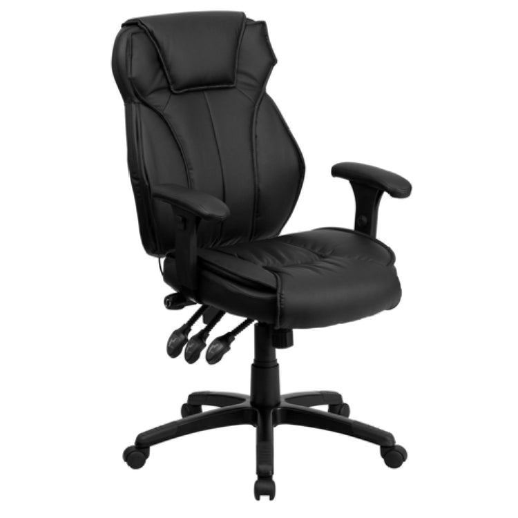 The Flash Furniture BT-9835H-GG Executive Swivel Office Chair 42-1/2" to 48-3/4" Adjustable Height is a sophisticated seating solution tailored for modern office environments. With a weight capacity of 250 lbs, this high back chair features a waterfall seat complemented by a headrest, ensuring ergonomic comfort during extended periods of use. The LeatherSoft upholstery combines the durability and elegance of leather and polyurethane, offering a soft and enduring seating experience. Its pressurized lumbar support knob and triple paddle control mechanism allow for personalized adjustments, while the infinite-locking back angle adjustment and multi-tilt lock mechanism provide versatile positioning options. The tilt tension adjustment knob and height-adjustable padded arms add to the chair's adaptability, accommodating various user preferences. Safety is prioritized with CA117 fire retardant foam, and stability is assured with the heavy-duty black nylon base and dual wheel casters. The assembly is required for this model, and in-stock items generally ship within 24 hours, making it an efficient choice for businesses aiming to enhance office productivity and comfort. This chair's comprehensive features make it a versatile asset for executives, managers, and professionals seeking a blend of functionality, comfort, and style in their workspace seating.