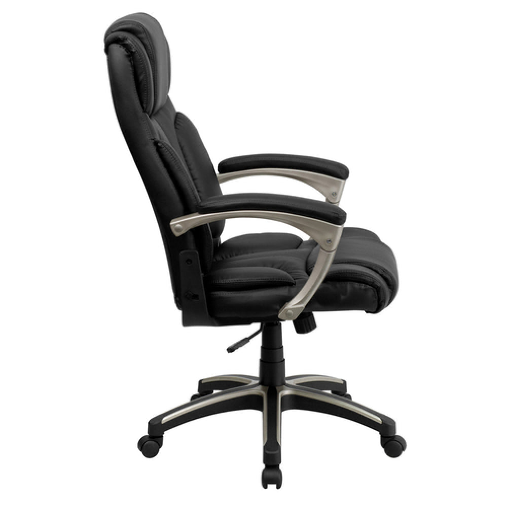 The Flash Furniture BT-9875H-GG Executive Swivel Office Chair is a versatile seating solution designed for comfort and functionality in various office settings. With an adjustable height ranging from 42-3/4" to 45-1/2", it accommodates different desk heights and user preferences, making it ideal for both corporate and home offices. The chair boasts a high back design with a contoured back and a contoured waterfall seat, enhancing ergonomic support and promoting good posture during extended periods of sitting. The inclusion of a headrest and built-in lumbar support further adds to the comfort, catering to users who demand superior support. Upholstered in LeatherSoft, a blend of leather and polyurethane, the chair ensures durability and a soft touch. Additional features include a tilt lock mechanism, tilt tension adjustment knob, and padded arms, allowing for customizable comfort. With a 250 lb. weight capacity and foldable back that adjusts from 23" to 26", this chair is adaptable to various body types and workspace requirements. The chair stands on a heavy-duty silver trimmed black nylon base equipped with dual wheel casters, ensuring stability and ease of movement. CA117 fire retardant foam enhances safety, while its assembly requirement ensures straightforward setup, with most orders shipping within 24 hours.
