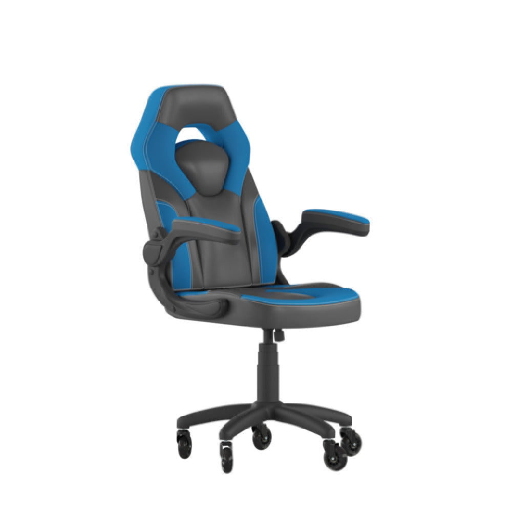 The Flash Furniture CH-00095-BL-RLB-GG X10 Gaming Chair is engineered for comfort and durability, featuring a 250 lb. weight capacity. It combines LeatherSoft upholstery with breathable mesh inserts to provide a premium seating experience. This high-back gaming chair is designed with lumbar support to enhance ergonomic posture during long gaming sessions or work hours. Its tilt lock mechanism and tilt tension adjustment knob allow for customized reclining, catering to different user preferences. The padded flip-up arms add versatility, offering support when needed and a space-saving solution when not. With a pneumatic seat height adjustment, users can easily modify the chair's height to suit their desk setup. The nylon base provides robust support, complemented by roller-style wheels for smooth and easy movement across various floor surfaces. The eye-catching blue and black color scheme adds a touch of style, making it a perfect addition to any gaming setup or home office. Assembly is required, but the chair’s thoughtful design ensures a straightforward setup process. This chair is a practical choice for gamers, professionals, and anyone in need of a comfortable, reliable seating solution.
