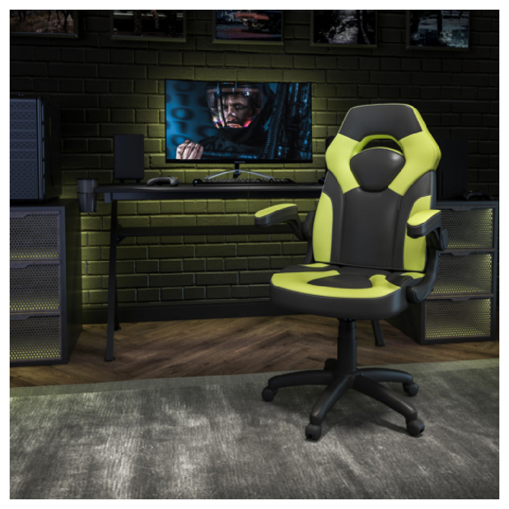The Flash Furniture CH-00095-GN-GG X10 Gaming Chair is a robust seating solution engineered for gaming enthusiasts and professionals, boasting a weight capacity of 250 lb. This chair features LeatherSoft upholstery with mesh inserts that combine durability and breathability. Its high-back design, coupled with lumbar support, ensures comfort during extended gaming sessions. The chair's tilt lock mechanism and tilt tension adjustment knob provide customizable reclining options, while the padded flip-up arms add versatility to its ergonomic design. A pneumatic seat height adjustment allows users to find their ideal seating position effortlessly. The chair is supported by a sturdy nylon base equipped with dual wheel casters, facilitating smooth mobility across various floor surfaces. Presented in a striking neon green/black color scheme, the Flash Furniture CH-00095-GN-GG X10 is an attractive addition to any gaming setup. Assembly is required for this chair, ensuring it meets specific user needs. Ideal for gamers, office workers, and anyone seeking a blend of style and functionality, this chair caters to different market segments, providing tailored comfort and performance for a wide range of users within the gaming industry.