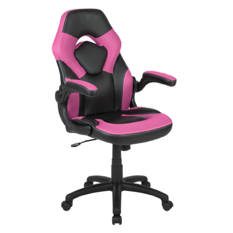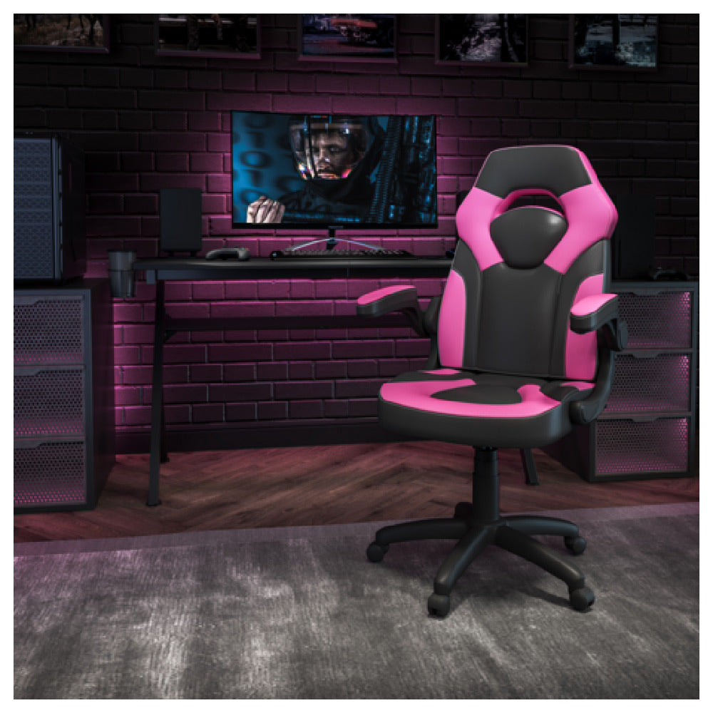 The Flash Furniture CH-00095-PK-GG X10 Gaming Chair is meticulously engineered to support a weight capacity of 250 lb. This chair is adorned with LeatherSoft upholstery, featuring mesh inserts that enhance breathability and comfort during extended gaming sessions. Its high-back design ensures comprehensive support, complemented by built-in lumbar support. The chair is equipped with a tilt lock mechanism and a tilt tension adjustment knob, allowing users to customize their seating position for maximum comfort. For added convenience, the chair includes padded flip-up arms and a pneumatic seat height adjustment, accommodating users of varying heights. The sturdy nylon base ensures durability and is fitted with dual wheel casters for smooth mobility across different floor surfaces. Available in a striking pink and black color scheme, this gaming chair requires assembly upon delivery. The Flash Furniture CH-00095-PK-GG X10 Gaming Chair is an exceptional choice for gamers seeking a blend of style, functionality, and ergonomic support. Its versatile features make it suitable for a wide range of users, from professional gamers to casual players, providing comfort and support for intense gaming or long hours at the computer.