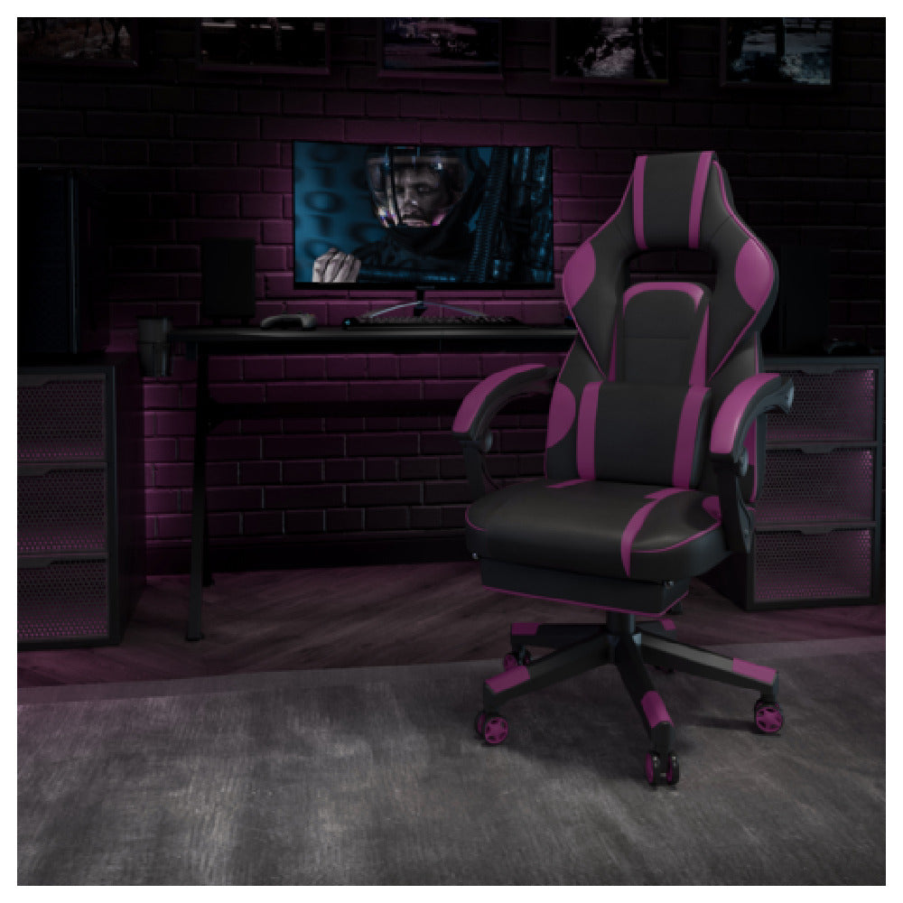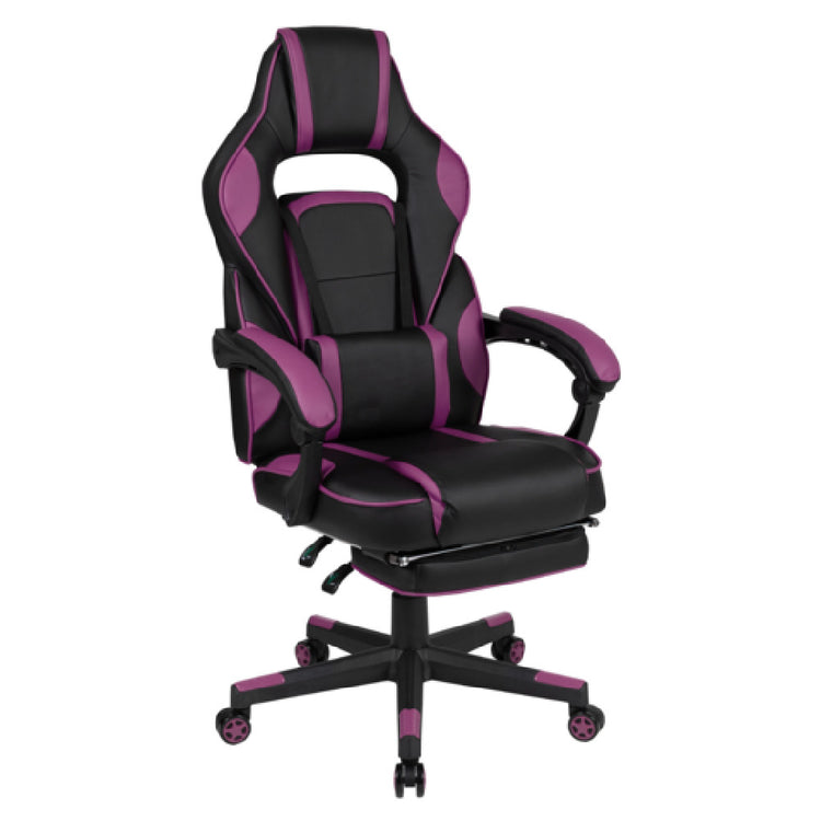 The Flash Furniture CH-00288-PR-GG X40 Gaming Chair is a sophisticated seating solution designed for gamers and professionals seeking comfort and functionality. With a weight capacity of 280 lb, this chair is built to accommodate a wide range of users, highlighting its robust and durable construction. The chair's LeatherSoft upholstery combines the elegance of leather with the comfort of fabric, creating a luxurious feel while ensuring easy maintenance. Its high-back design supports the spine, promoting ergonomic posture during long hours of gaming or work. Included is a removable massaging lumbar pillow, which adds an extra layer of comfort and relaxation. The chair features a fully reclining back and arms, allowing users to customize their seating position to their liking. Additionally, it comes equipped with a slide-out footrest for enhanced comfort. The pneumatic seat height adjustment offers easy customization for different desk heights. The chair's nylon base is integrated with end caps and dual-wheel casters, ensuring smooth movement and stability. The chair is available in a striking black and purple color combination, adding a touch of style to any space. Please note that assembly is required, providing an opportunity for a personalized setup experience.