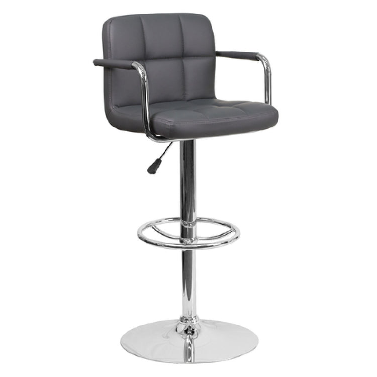 The Flash Furniture CH-102029-GY-GG Swivel Bar Stool With Arms Adjustable Height is a versatile seating option designed for residential use, delivering both style and functionality. Featuring a contemporary style with a mid-back design, this stool incorporates a swivel seat and gas lift mechanism, allowing for effortless height adjustment from counter to bar height. Its gray vinyl upholstery covers the quilted back and seat, providing comfort and a modern aesthetic, while the upholstered wrapped chrome arms add an element of sophistication. The stool's 19-1/2" diameter chrome base ensures stability and durability, complemented by a footrest for added comfort. Constructed with CA117 fire retardant foam, it enhances safety and peace of mind for users. The stool's features make it appealing across different market segments, such as homeowners looking to outfit their kitchen islands or bar areas with adaptable seating solutions that require assembly. The stool's design not only enhances residential spaces but also adds a touch of modern elegance, addressing the needs of those seeking both practicality and style. Available in stock, most items ship within 24 hours, ensuring efficiency and convenience for consumers seeking prompt delivery.