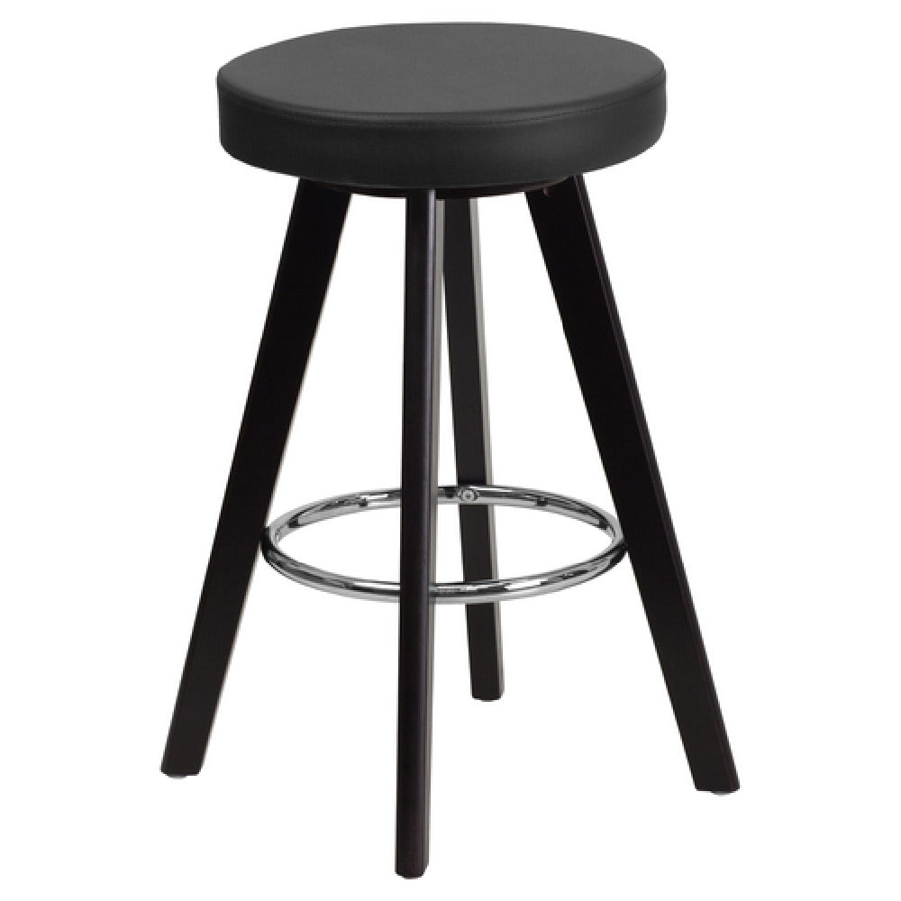 The Flash Furniture CH-152600-BK-VY-GG Trenton Series Bar Stool is a sophisticated addition to any counter-height seating arrangement, measuring 24 inches in seat height. This contemporary, backless bar stool is designed with an upholstered seat, offering a plush, comfortable experience. It features CA117 fire retardant foam, ensuring safety and compliance with industry standards. The stool's sturdy wood frame is adorned with a cappuccino finish, adding a touch of elegance to its modern style. For enhanced durability and user convenience, a chrome footring is incorporated, allowing for comfortable foot placement. The protective floor glides safeguard your floors from potential damage, making it suitable for a variety of residential settings. This stool is upholstered in black vinyl, which not only enhances its aesthetic appeal but also provides easy-to-clean practicality. Assembly is required, but with in-stock items typically shipping within 24 hours, the Flash Furniture CH-152600-BK-VY-GG Trenton Series Bar Stool is readily available to meet your immediate seating needs. Its blend of style, safety, and functionality makes it a versatile choice for homeowners looking to elevate their interior design with a contemporary touch, ensuring a harmonious fit in various home environments.
