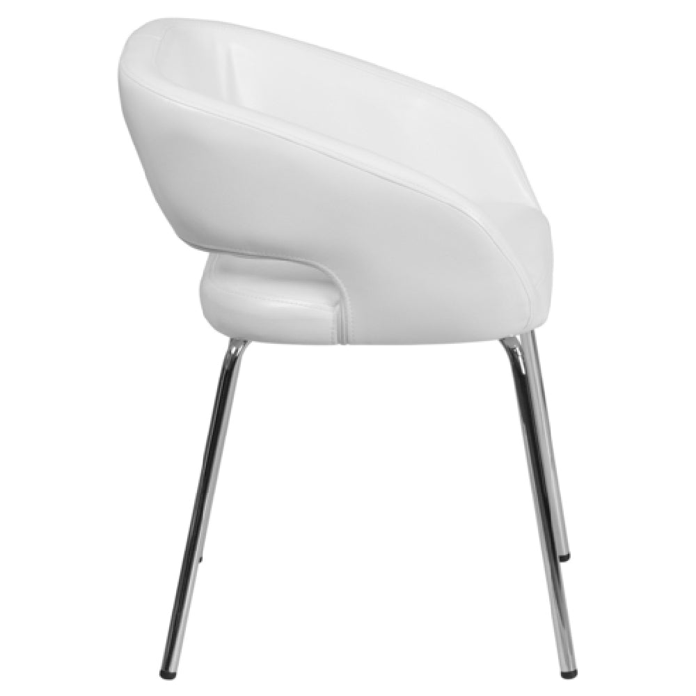 The Flash Furniture CH-162731-WH-GG Fusion Series Side/Reception/Lounge Chair is distinguished by its modern design and technical specifications, making it a versatile choice for both commercial and residential settings. Featuring a curved frame that enhances aesthetic appeal, this chair is upholstered in LeatherSoft, a durable blend of leather and polyurethane that provides a soft touch and increased wear resistance. Safety and compliance are prioritized with the inclusion of CA117 fire retardant foam, ensuring the chair meets stringent fire safety standards. The chair stands on sleek chrome legs, which not only contribute to its contemporary look but also provide sturdy support. For ease of movement and to protect flooring surfaces, the chair is equipped with plastic floor glides. Available in an elegant white finish, this piece requires assembly, allowing for convenient shipping and handling. Typically, in-stock items ship within 24 hours, making it a practical option for businesses and individuals needing prompt furnishing solutions. The Flash Furniture Fusion Series chair integrates style and functionality, catering to various market segments including corporate offices, hospitality venues, and home lounges, all seeking a sophisticated seating solution that aligns with modern interior aesthetics.