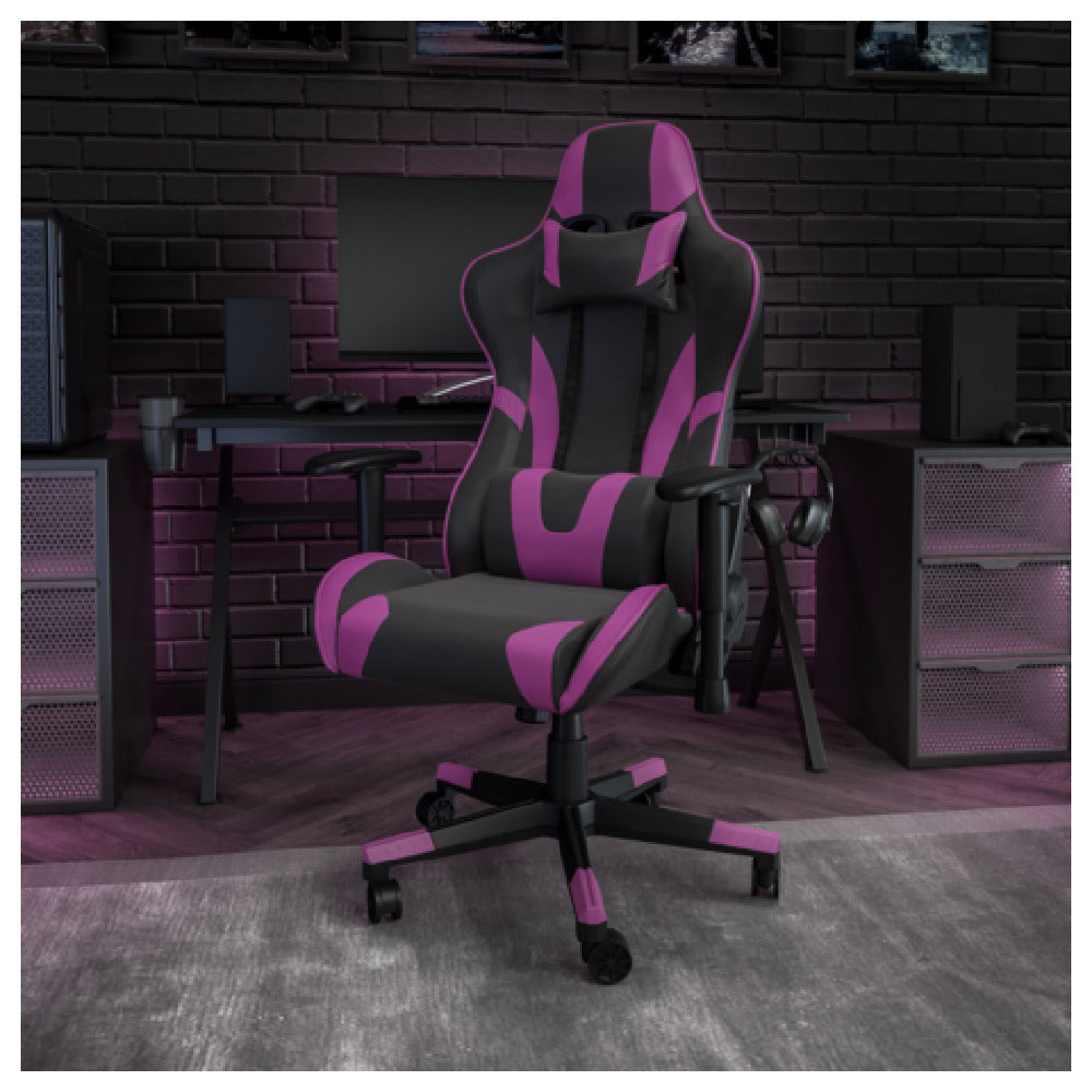 The Flash Furniture CH-187230-1-PR-GG X20 Gaming Chair Racing Office Ergonomic Computer PC Swivel Chair is a versatile seating solution designed to meet the diverse needs of gamers and office workers alike. This chair stands out with its ergonomic design, which includes an adjustable and fully reclining back that provides users with the ability to customize their seating position for optimal comfort during long hours of use. The chair is upholstered in LeatherSoft, a durable and soft material that combines leather and polyurethane for added comfort and longevity, and comes in a striking purple color, adding a vibrant touch to any space. The swivel feature allows for easy movement and accessibility, making it ideal for dynamic work environments or gaming setups. Whether you're a professional gamer, a dedicated home office worker, or a corporate employee, the Flash Furniture X20 Gaming Chair offers a unique balance of style, comfort, and functionality, making it an excellent investment for those looking to enhance their seating experience with a product that caters to both performance and aesthetic appeal.
