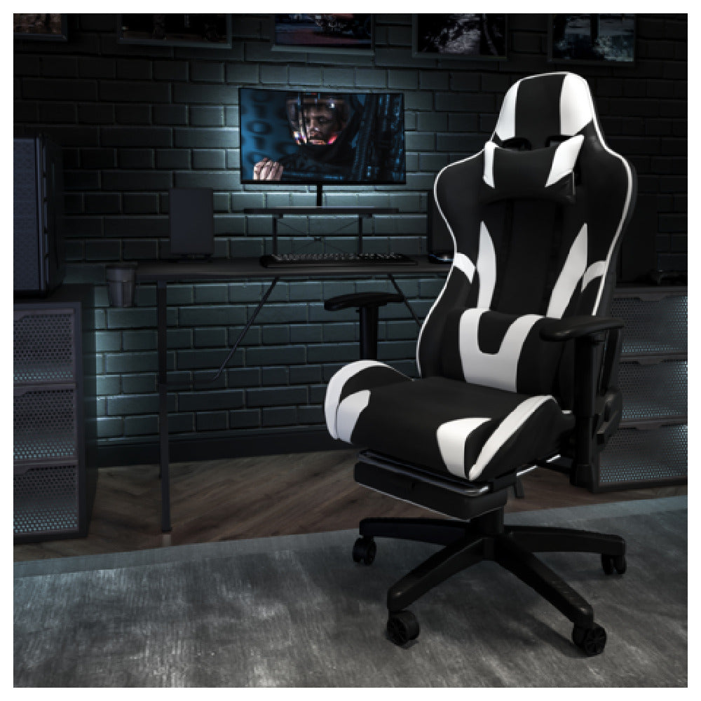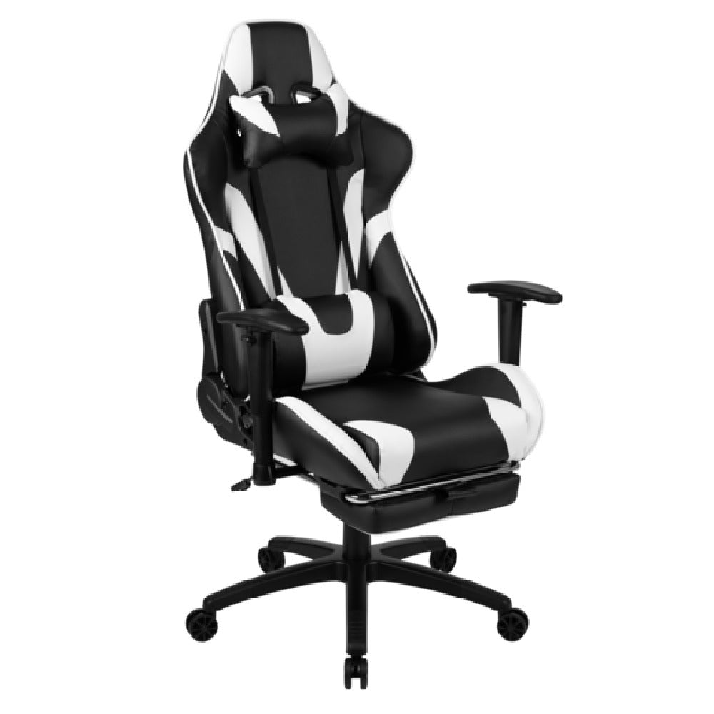 The Flash Furniture CH-187230-BK-GG X30 Gaming Chair is engineered for comfort and durability, supporting a substantial weight capacity of 280 lbs. This high-back gaming chair, upholstered in luxurious LeatherSoft material, combines the aesthetic appeal of leather with the soft comfort of fabric. Designed with the convenience of gamers in mind, it features removable headrest and lumbar pillows that provide customizable support for extended periods. The chair is equipped with height adjustable arms, allowing users to find their optimal gaming posture. A slide-out footrest adds an extra layer of relaxation, perfect for leisurely gaming sessions. Further enhancing its ergonomic design, the chair includes a pneumatic seat height adjustment, a tilt lock mechanism, and a tilt tension adjustment knob, enabling users to adapt the chair to their specific preferences. Its sturdy nylon base with end caps ensures stability, while the dual wheel casters facilitate smooth mobility across different floor surfaces. The chair's black and white color scheme offers a sleek, modern look, and assembly is required to set up this sophisticated piece of gaming furniture. This gaming chair is a versatile choice for various gaming environments, appealing to both casual and hardcore gamers with its functional and stylish design.
