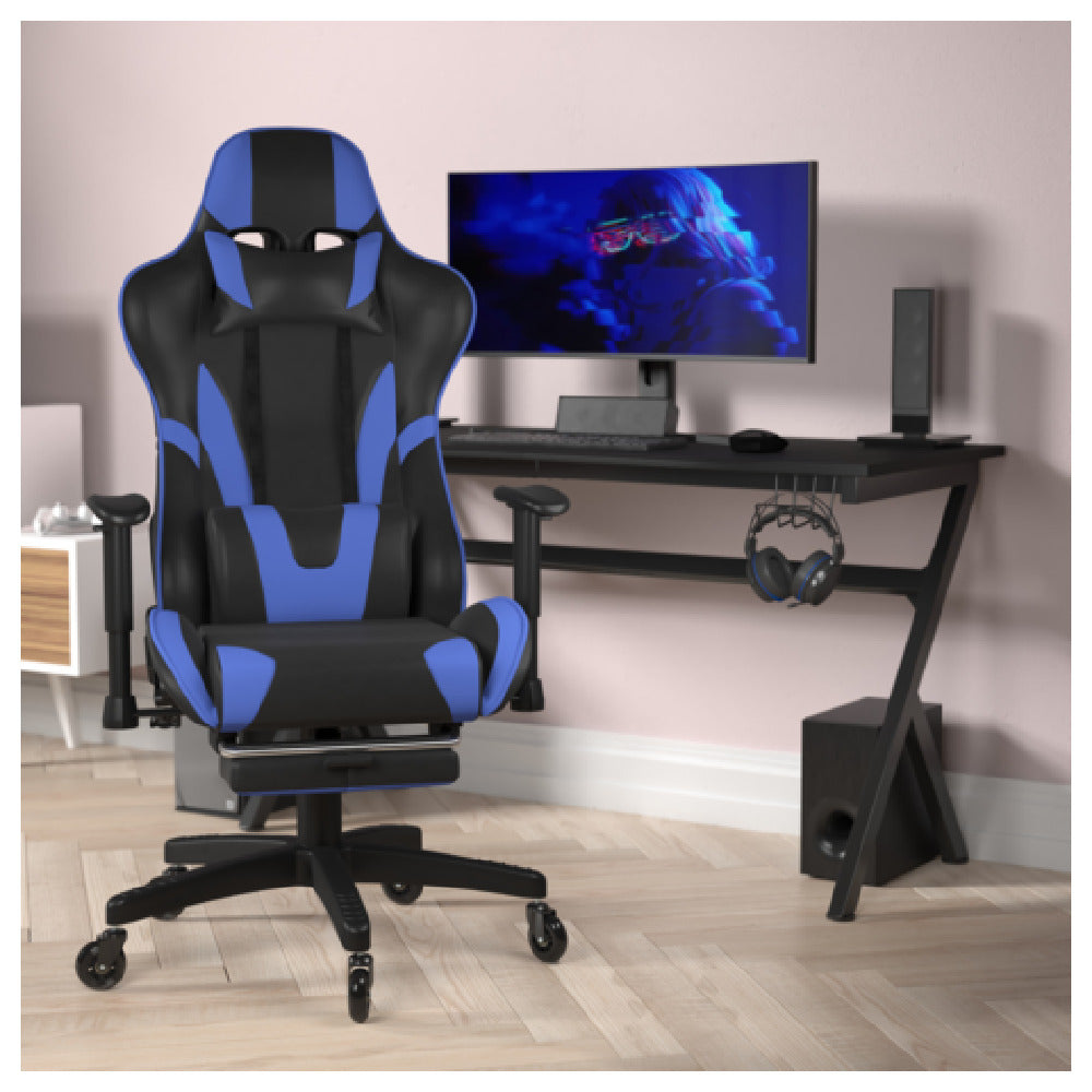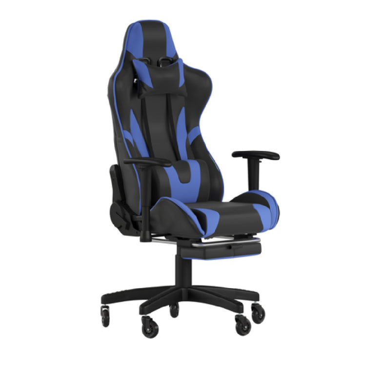 The Flash Furniture CH-187230-BL-RLB-GG X30 Gaming Chair stands out with its 280 lb. weight capacity and sophisticated LeatherSoft upholstery, making it an exemplary choice for gaming enthusiasts seeking durability and comfort. This high-back design is complemented by removable headrest and lumbar pillows, catering to extended gaming sessions and providing customizable support. The chair's height adjustable arms and slide-out footrest enhance ergonomic comfort, enabling users to personalize their seating experience. Equipped with a pneumatic seat height adjustment, it ensures seamless transitions to optimal seating positions. The tilt lock mechanism and tilt tension adjustment knob further allow for tailored reclining preferences, appealing to a diverse range of body types and preferences. A sturdy nylon base with end caps and roller style wheels promises stability and effortless mobility, while the striking black/blue color scheme adds a touch of modernity to any gaming setup. Assembly is required, but the chair's robust features and stylish design make it an indispensable asset for both casual gamers and dedicated professionals looking to enhance their gaming environment with a product that emphasizes both functionality and aesthetic appeal.