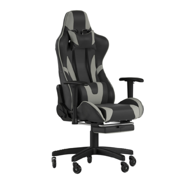 The Flash Furniture CH-187230-GY-RLB-GG X30 Gaming Chair is a high-performance seating solution engineered for avid gamers and professionals working long hours. With a robust weight capacity of up to 280 pounds, this chair is designed to accommodate a wide range of users comfortably. The chair features LeatherSoft upholstery, a blend of leather and polyurethane, providing a soft, smooth touch while ensuring durability. The high-back design offers ample support, enhanced by removable headrest and lumbar pillows, catering to ergonomic needs and allowing for customizable comfort. For added convenience, the height-adjustable arms and slide-out footrest provide additional versatility and support during extended use. The pneumatic seat height adjustment ensures an ideal seating position, while the tilt lock mechanism and tilt tension adjustment knob allow for personalized reclining preferences. Built on a sturdy nylon base with end caps, the chair is equipped with roller-style wheels for effortless mobility across different surfaces. Its sleek black and gray color scheme complements modern gaming setups, while assembly is required to fully experience its features. The Flash Furniture X30 Gaming Chair represents a sophisticated blend of style, comfort, and functionality, making it a valuable asset for both gaming enthusiasts and professionals in various segments of the market.