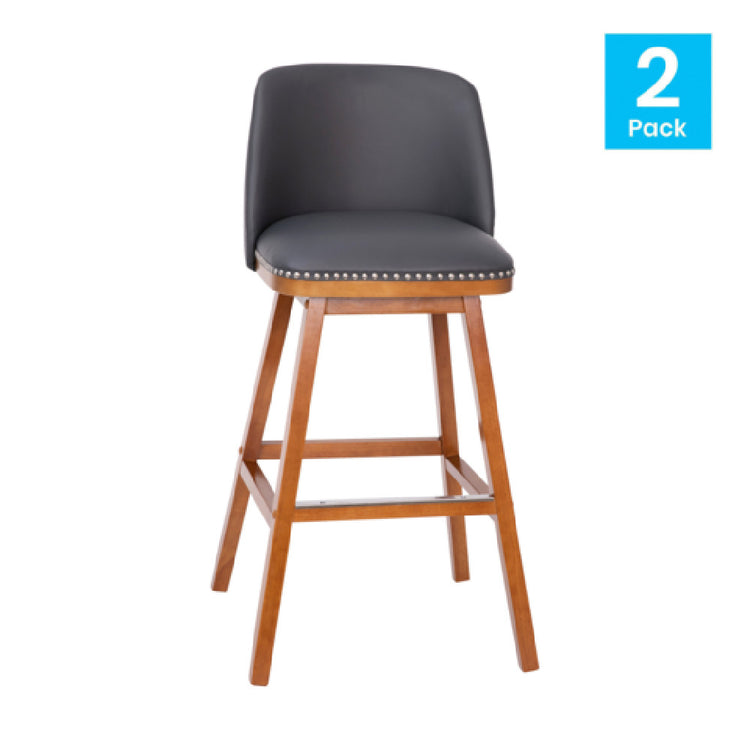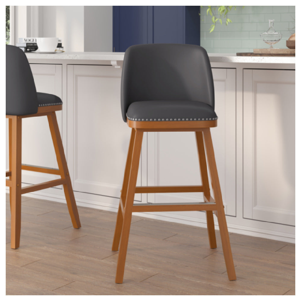The Flash Furniture CH-192162X000PU-30-GY-GG Julia Bar Stool is designed for those seeking a balance of style and strength in seating solutions. With a 300 lb. weight capacity, this bar stool is robust and resilient, ensuring durability for various settings, from residential kitchens to commercial bar environments. Standing at a 30" seat height, it suits standard bar and counter heights comfortably. The mid-back, armless design provides a minimalist aesthetic that complements modern interiors. Upholstered in LeatherSoft, an elegant combination of leather and polyurethane, the stool offers both comfort and easy maintenance. The accent nail trim adds a touch of sophistication, while the foam-padded back and seat ensure a comfortable seating experience. The stool features a walnut finish wooden frame, providing a classic and timeless appeal. Additionally, the built-in footrest enhances user comfort, making it an excellent choice for prolonged use. The set is available in gray, and requires assembly, offering flexibility and ease of transport. This set of two stools combines functionality and design, making it ideal for various market segments, including hotels, restaurants, and home use, where aesthetic appeal and durability are paramount.
