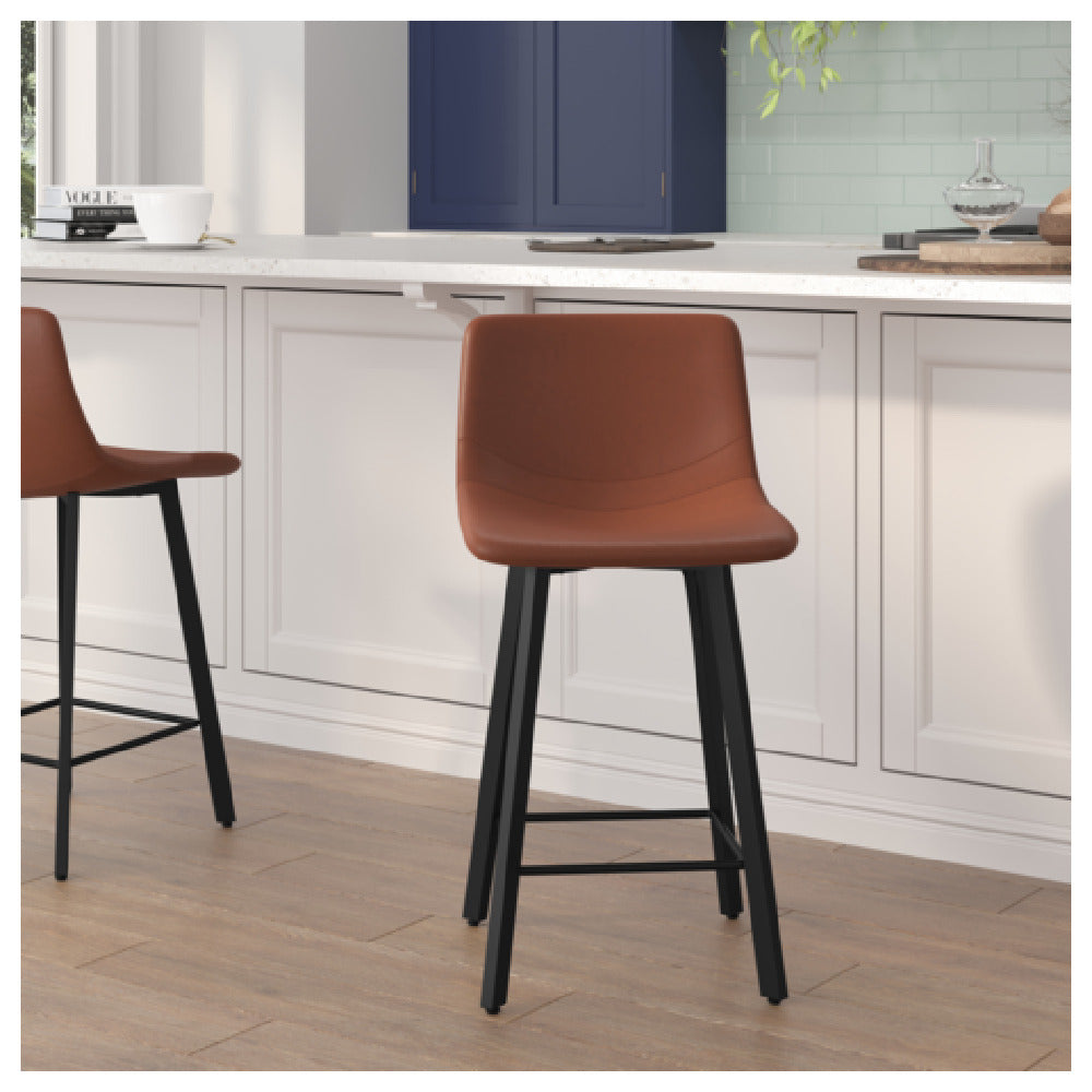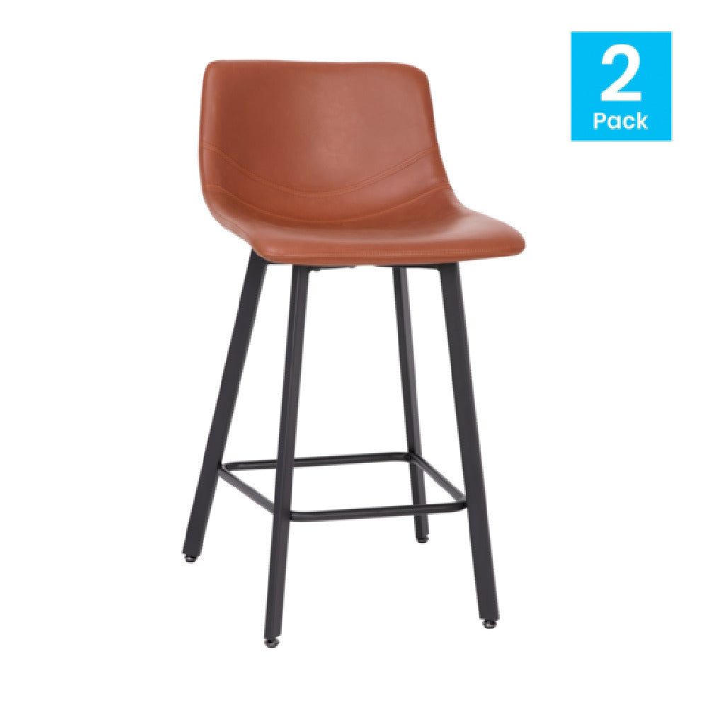 The Flash Furniture CH-212069-24-BR-GG Caleb Stool is a counter height seating solution designed for both style and functionality, featuring a 24-inch seat height that caters to a variety of counter settings. With a notable weight capacity of 300 pounds, this stool ensures durability and support across different user demographics. The LeatherSoft upholstery combines leather and polyurethane for added softness and durability, providing a comfortable seating experience. Its padded backs and bucket seats offer ergonomic support, making it an ideal choice for extended periods of sitting. The stool's matte finish iron frame is not only aesthetically pleasing but also robust, equipped with integrated footrests for additional comfort. Protective adjustable floor glides ensure stability on various floor surfaces, preventing scratches and scuffs. Available in a cognac color, this set of two stools requires assembly, allowing for convenient shipping and handling. The Flash Furniture Caleb Stool is particularly suitable for residential and commercial environments, including home kitchens, bars, and cafés, offering versatility and style to complement various interior designs.