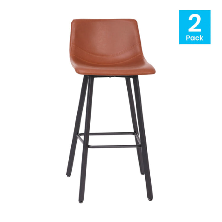 The Flash Furniture CH-212069-30-BR-GG Caleb Bar Stool is a versatile seating solution with a 300 lb. weight capacity, making it suitable for a variety of commercial and residential settings. Featuring a 30" seat height, this bar stool is ideal for use at high tables or bars. The LeatherSoft upholstery provides a plush, durable seating surface, combining the luxurious feel of leather with the resilience of polyurethane. The stool's padded backs and bucket seats enhance comfort, making it an excellent choice for long seating durations. The matte finish iron frame is both stylish and sturdy, equipped with integrated footrests for added support and relaxation. Protective adjustable floor glides ensure that your flooring remains unscathed, even with frequent movement. Available in an attractive cognac color, this set of two stools requires assembly, making it a practical choice for various hospitality environments, from upscale bars to casual dining spaces, offering both aesthetic appeal and functional reliability.