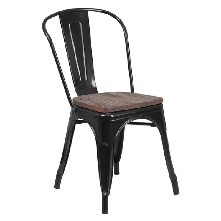 The Flash Furniture CH-31230-BK-WD-GG Stacking Side Chair is a versatile seating solution designed for various environments, offering a substantial weight capacity of 500 lbs. This bistro-style chair is stackable up to 8 chairs high, allowing for efficient storage and space-saving capabilities, making it ideal for both commercial and residential use. Featuring a metal curved back with a vertical slat design, it combines durability with a touch of elegance. The textured wood seat adds a classic aesthetic while ensuring comfort. With a cross brace complemented by protective plastic caps, this chair offers additional stability and floor protection. The powder coat finish enhances its longevity, while the plastic floor glides facilitate easy movement without damaging floors. Crafted from galvanized steel and finished in a sleek black color, this chair is built to withstand diverse conditions, making it suitable for cafes, restaurants, or any setting requiring robust and stylish seating. The Flash Furniture CH-31230-BK-WD-GG Stacking Side Chair not only meets functional needs but also adds a modern touch to any space, ensuring that it is an asset in environments ranging from casual dining areas to professional workspaces.