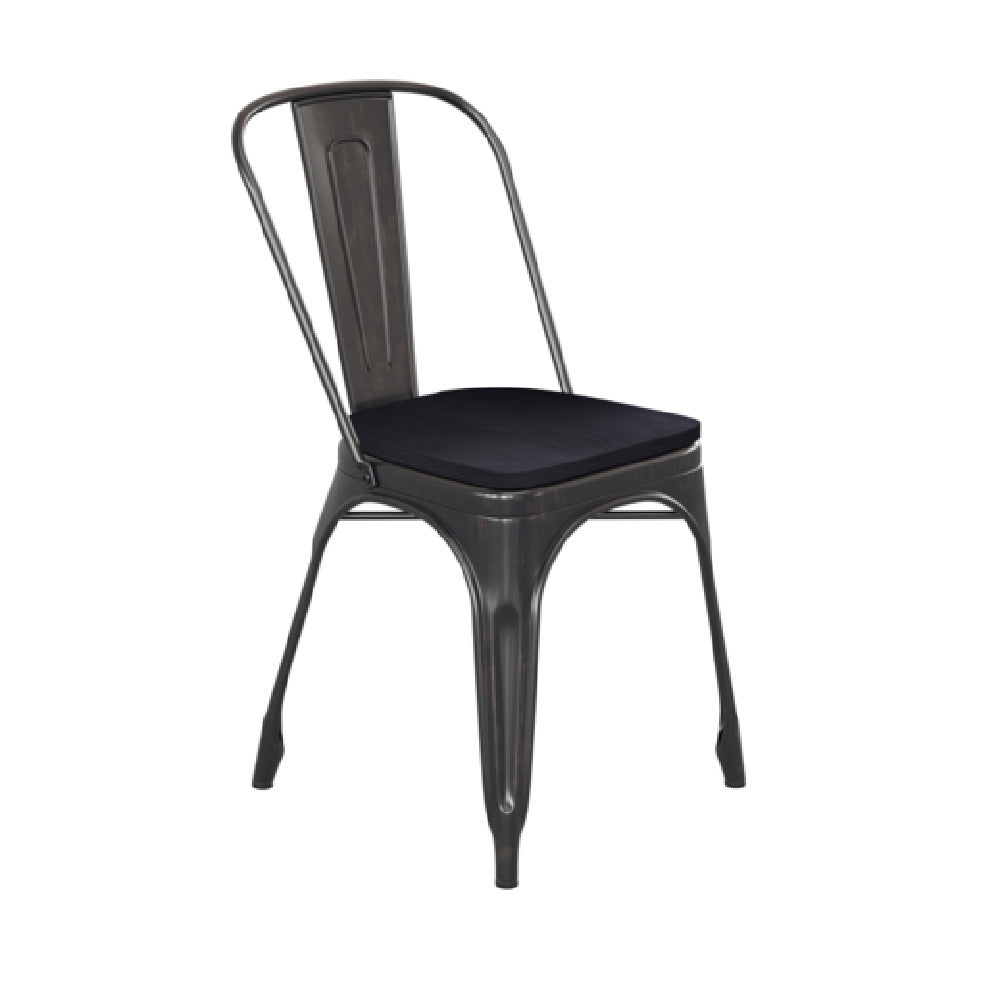 The Flash Furniture CH-31230-BQ-PL1B-GG Perry Stacking Side Chair is an expertly crafted seating solution designed to accommodate a weight capacity of up to 500 lbs. This durable chair features a sleek, curved back with a vertical slat, providing both comfort and style for a wide range of environments. The seat is made from black poly resin wood, which adds a sophisticated touch while ensuring longevity. Beneath the seat, a cross brace enhances stability, making it a reliable choice for both indoor and outdoor settings. Constructed from galvanized steel, this chair offers exceptional durability and resistance to the elements, ideal for settings such as cafes, bistros, or event spaces where versatile seating is essential. Plastic floor glides protect surfaces from scuffs and scratches, while the chair's ability to stack up to eight chairs high facilitates efficient storage and space management. The black antique gold finish adds an elegant aesthetic, making it suitable for various décor styles. The Perry Stacking Side Chair is an excellent choice for those seeking a combination of strength, flexibility, and classic design in seating arrangements.