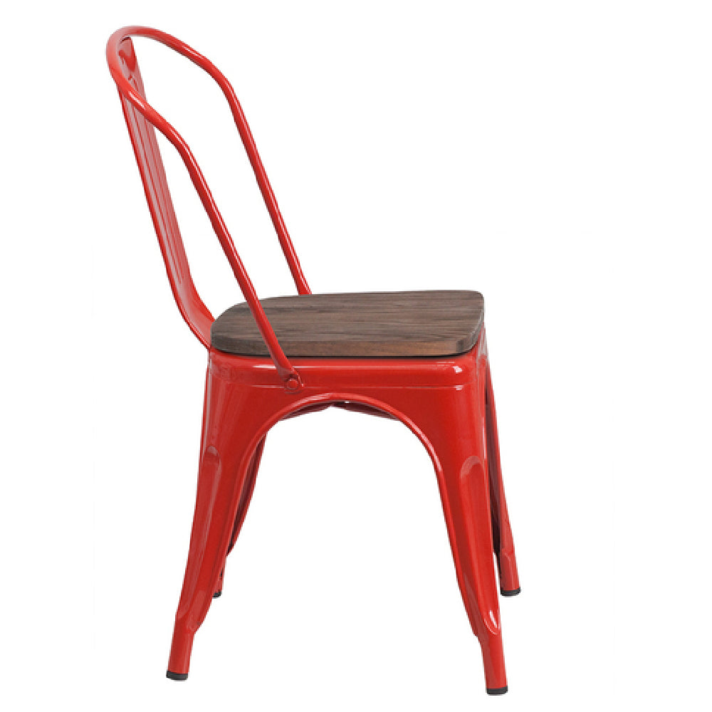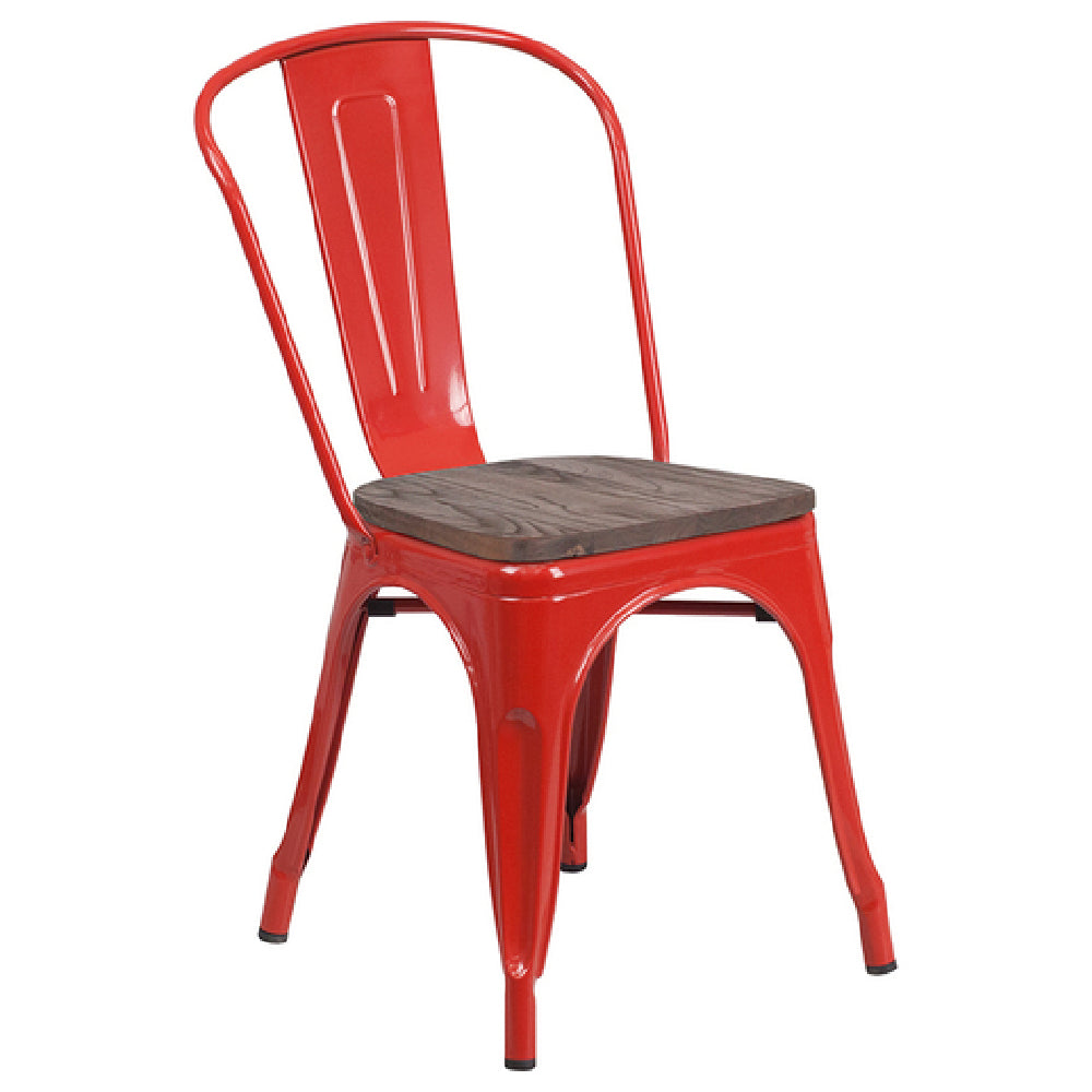 Flash Furniture CH-31230-RED-WD-GG Stacking Side Chair 500 Lb. Weight Capacity is a versatile seating solution that combines durability and style, making it suitable for various environments such as cafes, bistros, and dining spaces. This chair features a robust 500-pound weight capacity, highlighting its strength and sturdiness. Constructed with galvanized steel, it ensures longevity and resistance to wear and tear. The chair is designed with a metal curved back and a vertical slat, providing ergonomic support and comfort. Its textured wood seat adds an element of sophistication, while the powder coat finish in red enhances its aesthetic appeal. The chair is stackable up to 8 chairs high, offering convenient storage capabilities for spaces with limited room. A cross brace under the seat, equipped with protective plastic caps, adds stability and reduces wear on the chair structure. Plastic floor glides are included to protect flooring surfaces from scratches and damage. This chair is an excellent choice for both casual and formal settings, offering a blend of functionality and modern design.