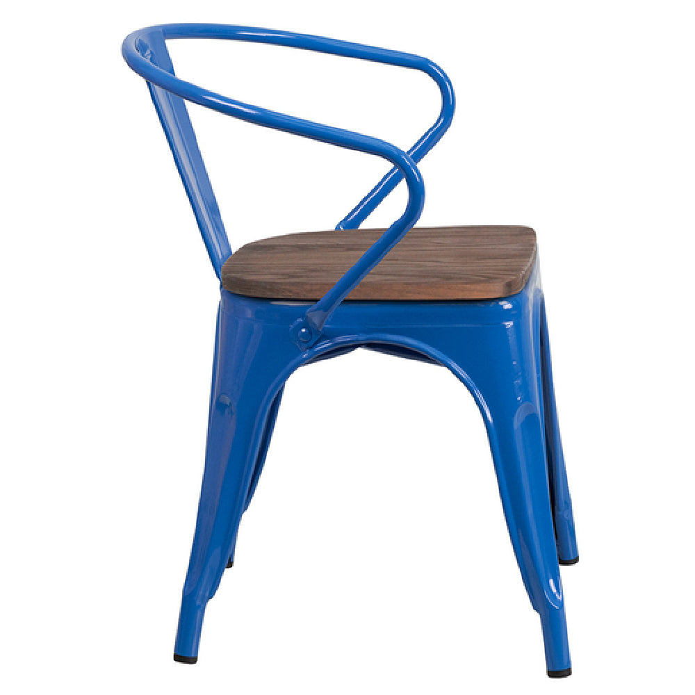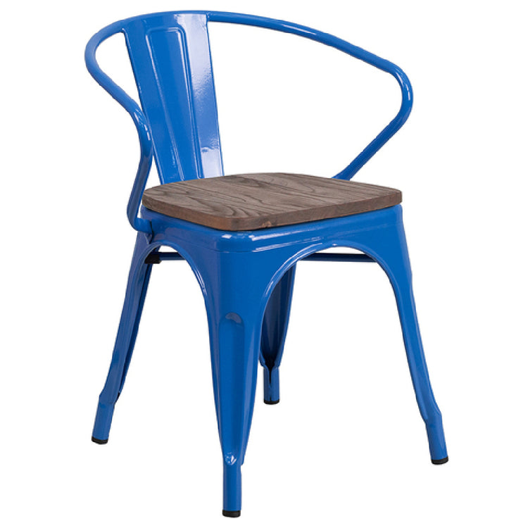 The Flash Furniture CH-31270-BL-WD-GG Stacking Armchair is a versatile seating solution designed with a robust 500 lb. weight capacity, making it suitable for a variety of environments, from bustling bistros to spacious event venues. This chair features a distinctive bistro style with a metal curved back complemented by a vertical slat, offering both aesthetic appeal and ergonomic support. It boasts integrated arms for added comfort, while the textured wood seat provides a touch of elegance. The chair's stackability up to 8 chairs high ensures space-saving storage, crucial for dynamic spaces requiring flexibility in seating arrangements. Constructed from galvanized steel with a durable powder coat finish, this chair promises enduring resilience and resistance to wear. The addition of a cross brace with protective plastic caps enhances stability and prevents damage during stacking. Fitted with plastic floor glides, this chair protects flooring surfaces from scratches, making it suitable for both indoor and outdoor use. Available in a vibrant blue, the Flash Furniture CH-31270-BL-WD-GG Stacking Armchair combines functionality with style, catering to diverse segment markets including hospitality, catering, and event management industries, where durability and efficient use of space are paramount.