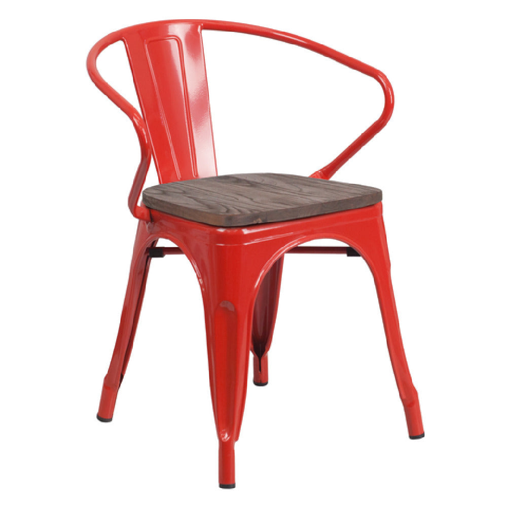 The Flash Furniture CH-31270-RED-WD-GG Stacking Armchair is a versatile seating solution designed for various environments, offering a robust weight capacity of 500 lbs. This bistro-style chair is stackable up to 8 chairs high, making it ideal for spaces where storage efficiency is crucial. It features a metal curved back with a vertical slat, providing both comfort and style. The chair comes with integrated arms and a textured wood seat, adding a touch of elegance and practicality. Its construction is reinforced with a cross brace equipped with protective plastic caps, ensuring durability and stability. Made from galvanized steel, the chair is coated with a powder coat finish, offering enhanced resistance to the elements and everyday wear. Additionally, plastic floor glides are included to protect flooring surfaces from scratches and damage. The vibrant red color of this chair adds a bold and contemporary look, making it a standout choice for cafes, restaurants, and social gatherings. The Flash Furniture CH-31270-RED-WD-GG Stacking Armchair seamlessly combines functionality with aesthetic appeal, catering to a wide range of market segments looking for dependable and stylish seating options.