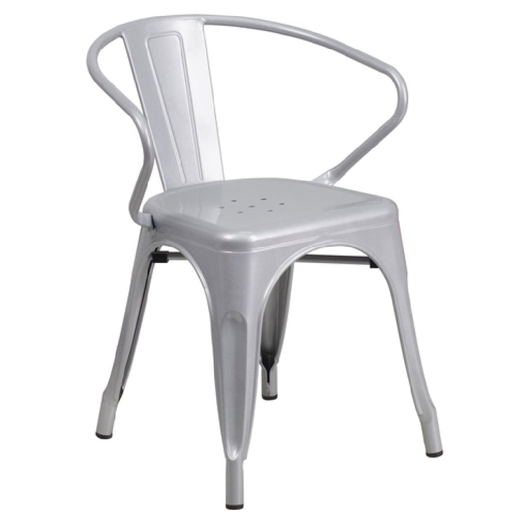 The Flash Furniture CH-31270-SIL-GG Armchair is a practical seating solution, supporting a weight capacity of up to 500 lbs, making it suitable for a variety of users in different settings. Its design features a curved back with a vertical slat, ensuring both aesthetic appeal and ergonomic support. Constructed from galvanized steel, this armchair boasts a powder coat finish that enhances its durability, making it ideal for both indoor and outdoor environments. The chair is equipped with drain holes in the seat, promoting quick drying after exposure to moisture, while a cross brace under the seat provides additional stability and strength. For ease of movement without damaging floors, plastic floor glides are incorporated into the design. The armchair's lightweight nature allows for effortless stacking, with the ability to stack up to 8 chairs high, optimizing storage space in commercial and residential settings. Available in a sleek silver color, in-stock items are typically ready for shipping within 24 hours, ensuring prompt delivery for buyers. This armchair is a versatile and reliable choice for those seeking a balance of strength and style in their seating arrangements.