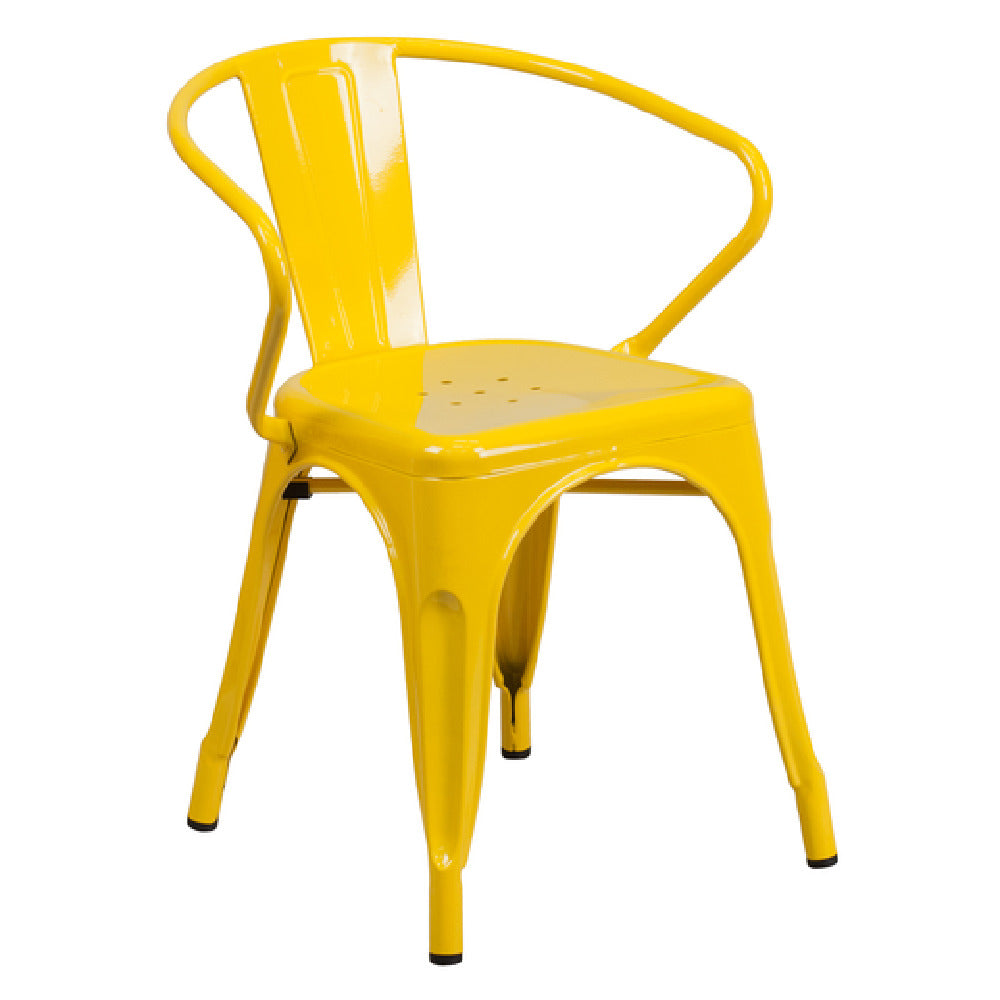 The Flash Furniture CH-31270-YL-GG Armchair is a premium seating solution designed for both commercial and residential settings, offering a substantial weight capacity of 500 lbs. This armchair features a curved back with a vertical slat, providing both comfort and a stylish design. The seat is equipped with drain holes to prevent water accumulation, making it suitable for outdoor use. Constructed from galvanized steel, the chair boasts a durable powder coat finish, ensuring long-lasting protection against the elements. It includes a cross brace under the seat for added stability, while plastic floor glides allow for easy movement across different surfaces without causing damage. This lightweight chair is designed for versatility, capable of stacking up to 8 armchairs high, making it ideal for spaces that require flexible seating arrangements. Available in a vibrant yellow color, this chair adds a pop of brightness to any space. Items in stock are typically shipped within 24 hours, ensuring quick delivery. The Flash Furniture CH-31270-YL-GG Armchair is a practical and stylish choice for any environment, combining robust construction with a contemporary design for diverse market segments.