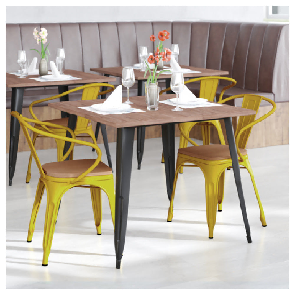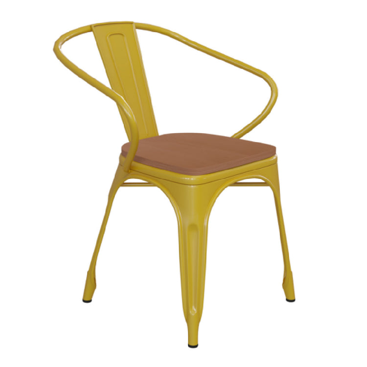 The Flash Furniture CH-31270-YL-PL1T-GG Luna Armchair is a versatile seating solution that caters to both commercial and residential sectors with a remarkable 500 lb. weight capacity. Its design incorporates a curved back with a vertical slat, enhancing both comfort and aesthetic appeal. The chair features a teak resin wood seat, providing durability and a stylish look, ideal for varied environments. A cross brace under the seat adds structural stability, ensuring long-lasting use. Constructed from galvanized steel, this armchair is built to withstand diverse weather conditions, making it suitable for both indoor and outdoor use. Available in a vibrant yellow color, it adds a splash of brightness to any setting. The chair is engineered for efficient storage, stacking up to 8 armchairs high, which is particularly advantageous for businesses with limited space. This stacking capability, combined with its robust construction, makes the Luna Armchair a practical choice for restaurants, cafes, and event venues, as well as residential gardens and patios. Its adaptable design and high weight capacity offer significant value across various segments, from hospitality to home use, ensuring it meets both aesthetic and functional requirements.