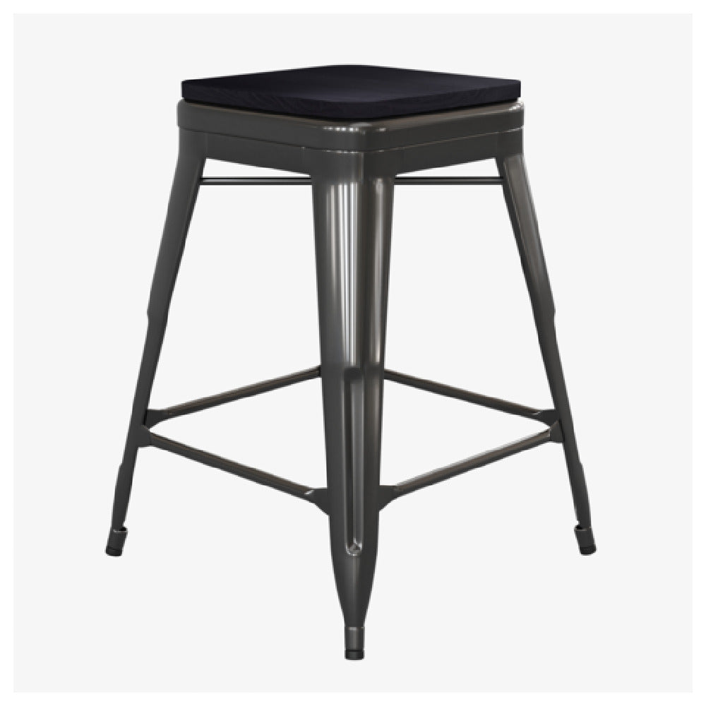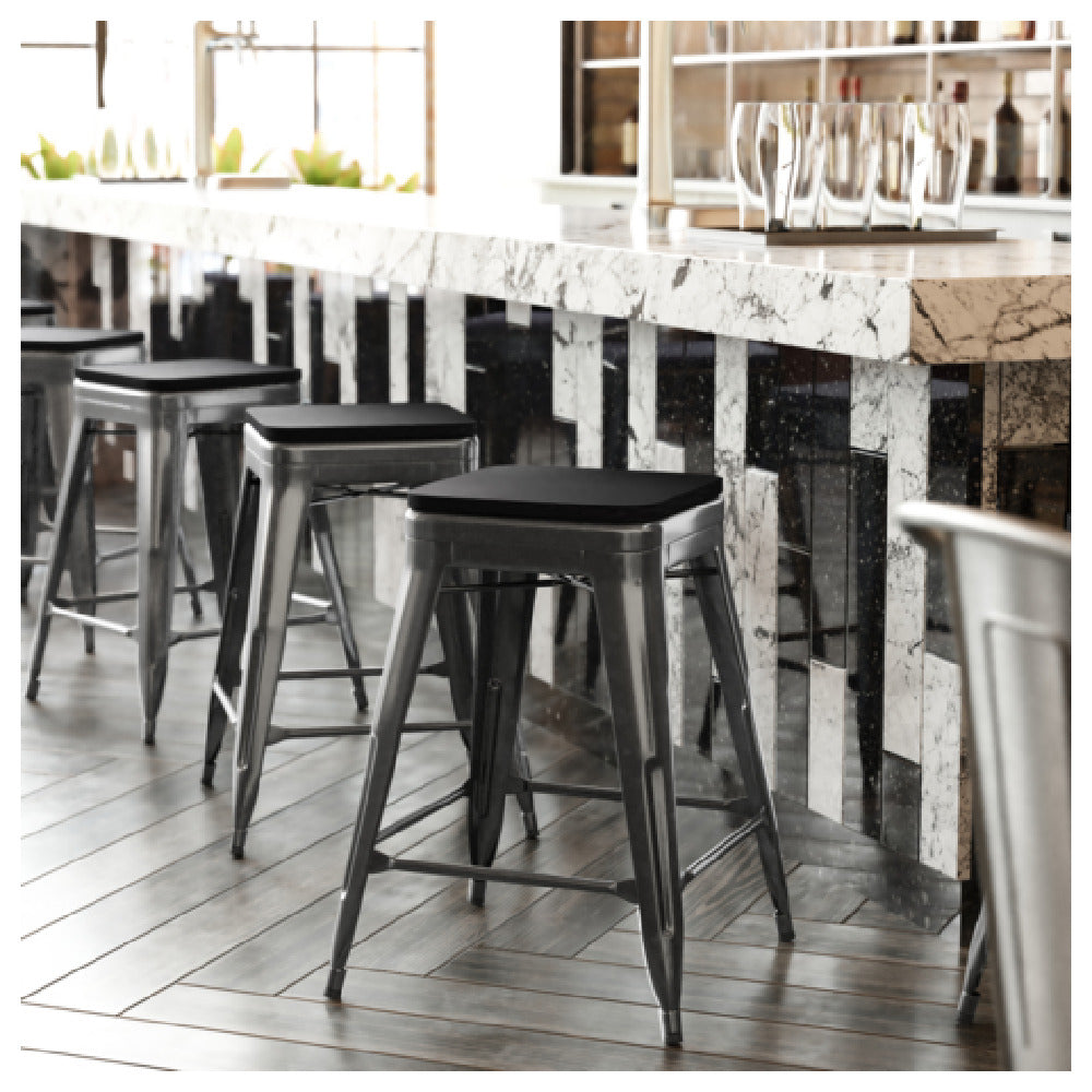 The Flash Furniture CH-31320-24-BK-PL2B-GG Kai Bar Stool is engineered to combine both strength and style, accommodating a weight capacity of up to 500 lbs. This counter-height stool is designed for durability and versatility, making it an ideal choice for various settings such as residential kitchens, commercial bars, and event spaces. The stool features a backless design with a sleek poly resin wood seat, enhancing its minimalist appeal. Constructed with galvanized steel, it boasts a durable powder coat finish that ensures longevity and resistance to wear and tear. The inclusion of a cross brace under the seat adds extra stability, while the integrated footrest provides comfort for extended use. Plastic floor glides are fitted to protect flooring surfaces and facilitate easy movement. This lightweight stool can be stacked up to four stools high, saving valuable storage space when not in use. Available in black, the Kai Bar Stool requires assembly and is efficiently shipped, with in-stock items typically dispatched within 24 hours. Its unique combination of robust construction and practical design makes it a suitable option for different market segments within the hospitality and home furnishing industries.