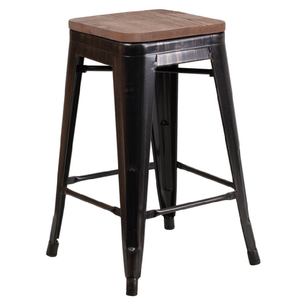 The Flash Furniture CH-31320-24-BQ-WD-GG Bar Stool is a versatile seating solution designed with a 500 lb weight capacity, making it suitable for diverse environments including high-traffic commercial spaces and residential settings. This counter-height stool features a backless design and a textured wood seat, providing a blend of rustic charm and modern functionality. It is engineered with a galvanized steel frame and a durable powder coat finish, ensuring long-lasting durability and resistance to wear. The stool includes a cross brace under the seat that enhances stability, while the integrated footrest offers added comfort for extended seating periods. Equipped with plastic floor glides, this stool protects flooring from scratches and scuffs, making it ideal for both indoor and outdoor use. Its lightweight design allows for easy stacking, accommodating up to 4 to 8 stools high for efficient storage solutions. Finished in a distinctive black antique gold, this bar stool adds a touch of elegance to any space. With assembly required, the Flash Furniture CH-31320-24-BQ-WD-GG Bar Stool combines functionality and style, meeting the demands of various markets within the furniture industry. Additionally, in-stock items typically ship within 24 hours, offering quick delivery for urgent needs.