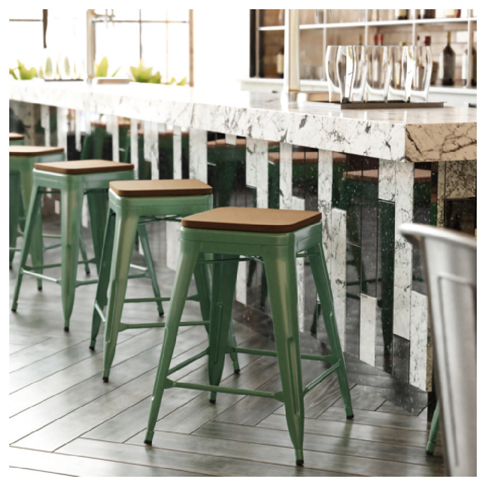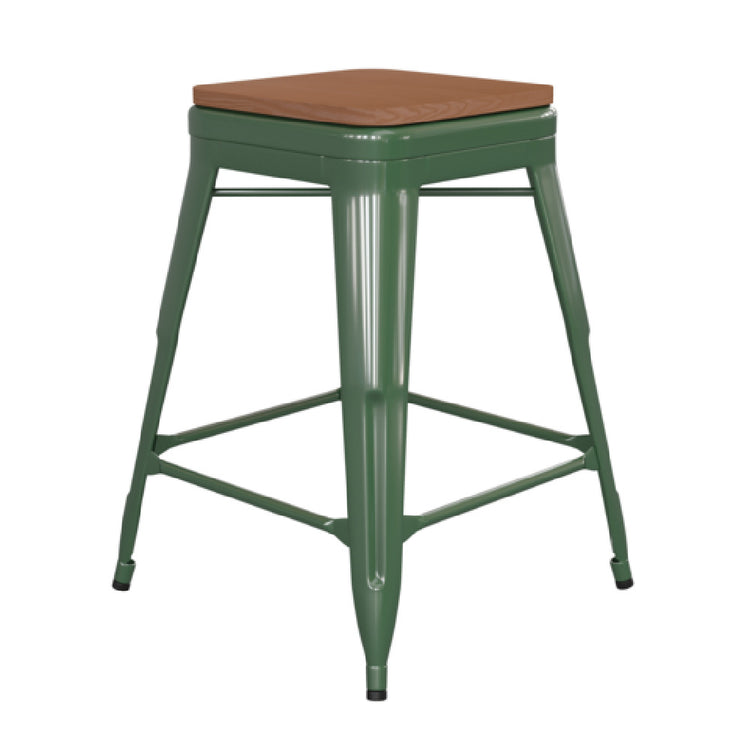 The Flash Furniture CH-31320-24-GN-PL2T-GG Kai Bar Stool is engineered to accommodate a substantial weight capacity of 500 lbs, making it a robust choice for a variety of settings. This counter-height stool is designed without a back and features a teak poly resin wood seat, offering a blend of durability and aesthetic appeal. The stool is reinforced with a cross brace under the seat, enhancing its structural integrity, and is constructed from galvanized steel with a powder coat finish that provides resistance to wear and corrosion. A footrest adds to the comfort of the user, while plastic floor glides ensure protection for flooring surfaces. Its lightweight design allows for easy handling and it is stackable up to four stools high, optimizing storage efficiency. The vibrant green finish adds a touch of color to any environment. This product requires assembly, and in-stock items typically ship within 24 hours. The combination of strength, style, and functionality makes it suitable for various segment markets, including commercial environments such as bars and restaurants, as well as residential spaces seeking durable and stylish seating solutions.