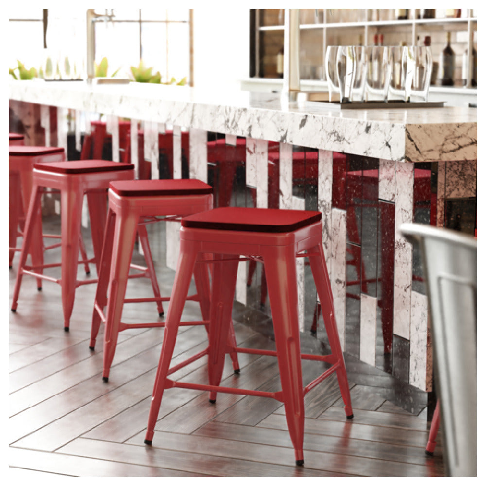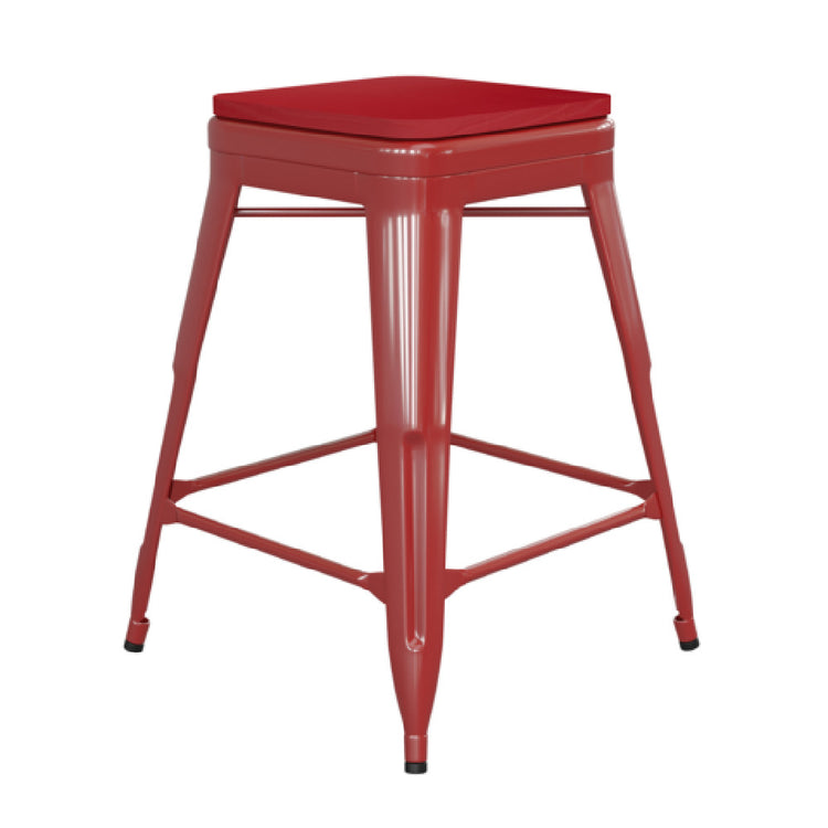 The Flash Furniture CH-31320-24-RED-PL2R-GG Kai Bar Stool is a sturdy and stylish seating solution, designed to support a substantial weight capacity of 500 lb. This counter height, backless stool is distinguished by its vibrant red poly resin wood seat, which adds a touch of modern flair to any setting. The stool's construction features a cross brace under the seat for enhanced support and stability. Built with galvanized steel and sporting a powder coat finish, this stool is durable and resistant to wear, making it suitable for both commercial and residential environments. Its built-in footrest offers additional comfort, while the inclusion of plastic floor glides ensures the protection of various floor surfaces. Furthermore, the stool is lightweight and can be stacked up to four stools high, facilitating easy storage and transport. Assembly is required upon delivery, but the product is typically shipped within 24 hours when in stock. The Flash Furniture Kai Bar Stool appeals to a diverse range of markets, from hospitality and entertainment venues looking for durable and attractive seating options to homeowners seeking functional and stylish bar furniture. Its robust design and practical features offer a blend of comfort, convenience, and contemporary aesthetics.