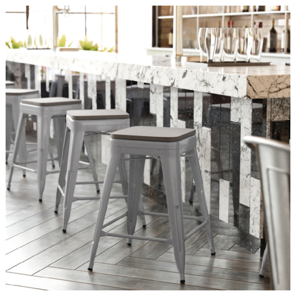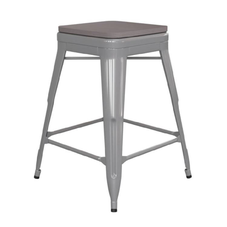 The Flash Furniture CH-31320-24-SIL-PL2G-GG Kai Bar Stool is engineered to support a substantial weight capacity of 500 lb, highlighting its robust construction suited for various environments, from commercial settings to residential spaces. This backless bar stool features a counter height design, making it an adaptable addition to kitchen islands or bar areas. It is distinguished by a gray poly resin wood seat, offering a sleek and modern aesthetic that complements its galvanized steel frame. The stool’s durability is enhanced by a powder coat finish, which provides resistance to wear and tear. A cross brace under the seat ensures additional stability, making it a reliable seating solution. Equipped with a footrest, it offers added comfort for extended use. For convenience in storage and space management, the lightweight design allows the stools to stack up to four high. The silver finish adds a touch of elegance, while the plastic floor glides protect flooring surfaces from scratches. This product requires assembly but promises quick shipping for in-stock items, typically within 24 hours, ensuring timely delivery for urgent needs. Its versatile design and sturdy build make it a valuable choice for a wide range of market segments within the furniture industry.