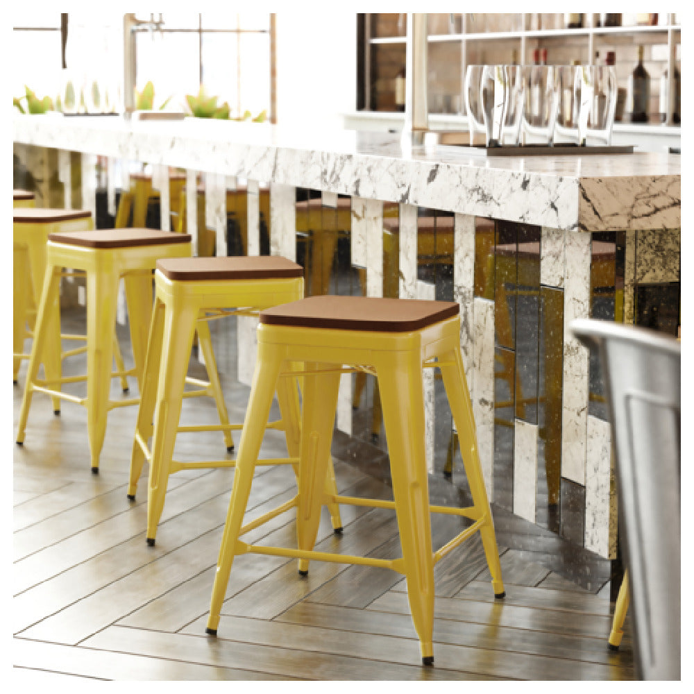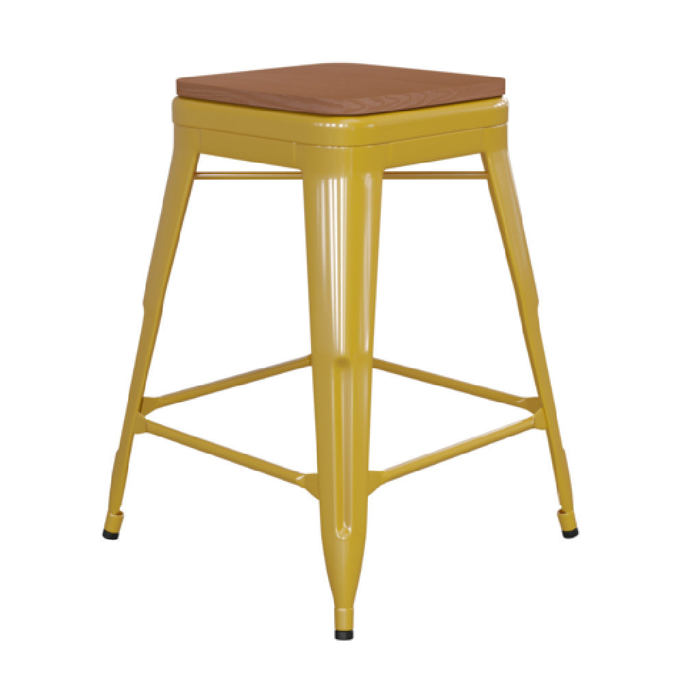 Flash Furniture CH-31320-24-YL-PL2T-GG Kai Bar Stool 500 Lb. Weight Capacity Counter Height is a meticulously designed seating solution catering to various market segments, including hospitality, commercial, and residential spaces. This backless bar stool boasts a substantial weight capacity of 500 lbs, making it a reliable choice for diverse environments. Its counter height design is complemented by a durable teak poly resin wood seat, providing both comfort and longevity. The stool's galvanized steel construction, enhanced by a vibrant yellow powder coat finish, ensures robust durability and a striking aesthetic. A cross brace under the seat adds extra stability, while the integrated footrest promotes user comfort during extended seating periods. Equipped with plastic floor glides, these stools protect flooring surfaces and facilitate smooth movement. The lightweight design allows for convenient handling and storage, stacking up to four stools high when not in use. Assembly is required, but the product's thoughtful engineering ensures a straightforward process. Typically, in-stock items ship within 24 hours, providing a prompt and efficient solution for furnishing needs. The Flash Furniture Kai Bar Stool is an excellent choice for those seeking a blend of functionality, style, and resilience in their seating options.