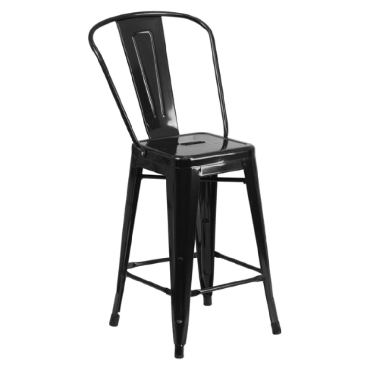 The Flash Furniture CH-31320-24GB-BK-GG Bar Stool 500 Lb. Weight Capacity Counter Height is a robust seating solution designed for both commercial and residential environments. This bar stool boasts a substantial weight capacity of 500 pounds, providing sturdy support for a wide range of users. Its counter height design features a curved back with a vertical slat that not only adds aesthetic appeal but also offers ergonomic support. The seat is equipped with a drain hole, making it suitable for outdoor use by allowing rainwater to pass through easily. Constructed from galvanized steel with a durable powder coat finish, this stool is built to withstand the elements, making it ideal for indoor and outdoor settings. The inclusion of a cross brace under the seat enhances its structural integrity, while the footrest ensures added comfort for users. Lightweight and versatile, this bar stool is designed with plastic floor glides to protect flooring surfaces from scratches, making it a practical choice for a variety of settings. Available in classic black, this stool requires assembly and is ready for prompt shipment, with in-stock items typically dispatched within 24 hours. Its combination of strength, style, and functionality makes it a valuable asset for diverse market segments seeking reliable seating solutions.