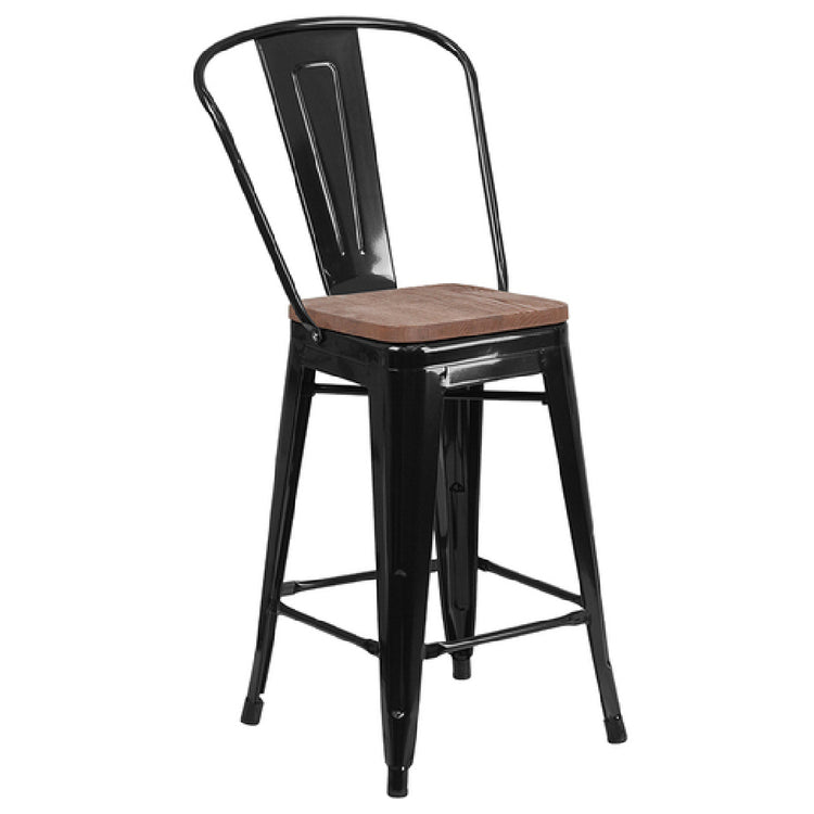 The Flash Furniture CH-31320-24GB-BK-WD-GG Bar Stool is a versatile seating solution with a substantial 500 lb. weight capacity, making it suitable for a variety of settings, from bustling commercial spaces to modern home kitchens. Designed at a counter height, it seamlessly fits both traditional and contemporary environments. This stool features a bistro style with a metal curved back complemented by a vertical slat, providing both aesthetic appeal and ergonomic support. The textured wood seat adds a touch of elegance and comfort, while the cross brace underneath enhances stability. A built-in footrest ensures additional comfort for prolonged use. The protective powder coat finish not only adds durability but also a refined look to the stool's sleek black design. Rubber floor glides are included to protect flooring and facilitate easy movement across surfaces. Lightweight in construction, this stool is easy to rearrange or store as needed. Assembly is required, and its practicality is underscored by the fact that in-stock items typically ship within 24 hours. The Flash Furniture CH-31320-24GB-BK-WD-GG Bar Stool's combination of strength, style, and functionality makes it a valuable addition to any industry segment needing robust and stylish seating options.