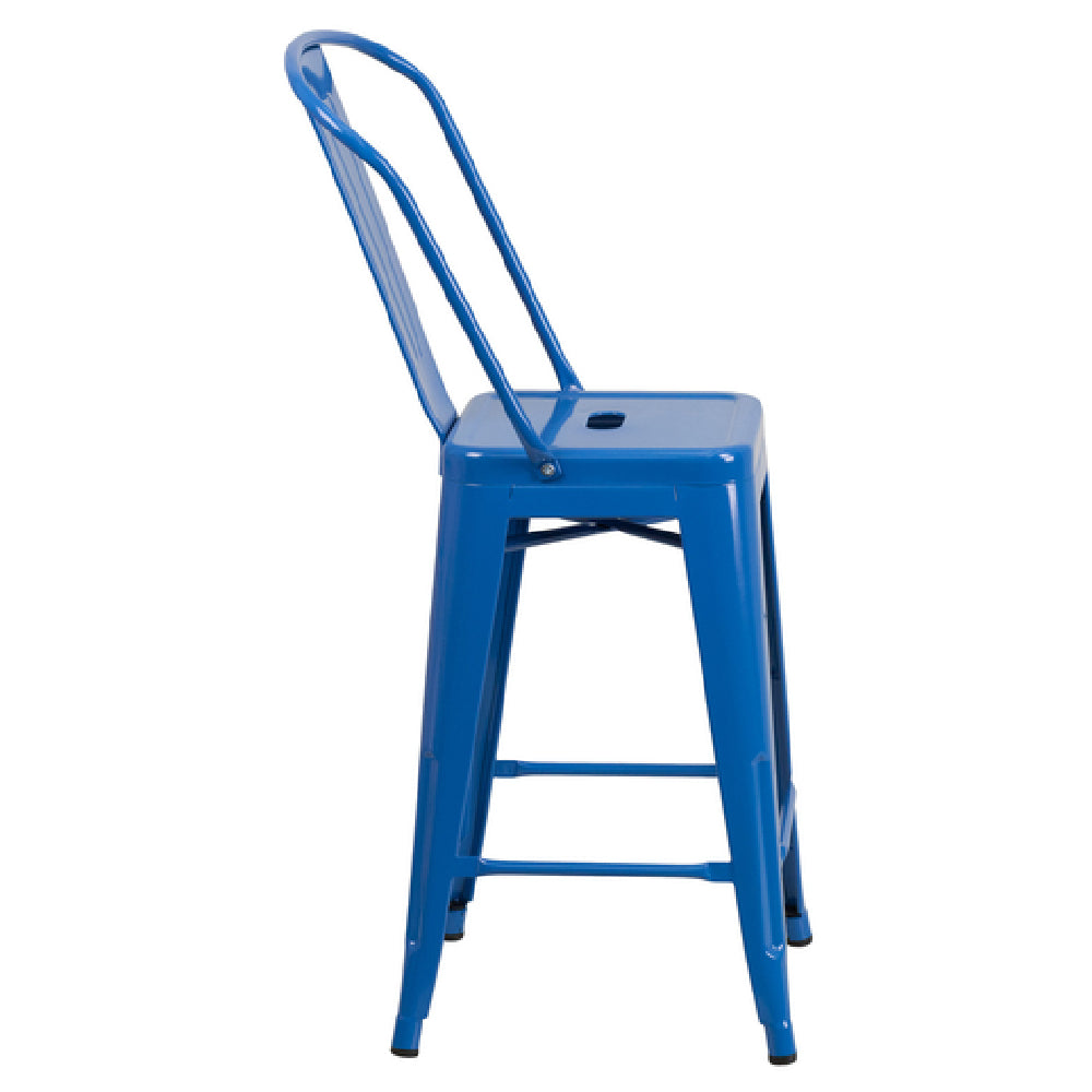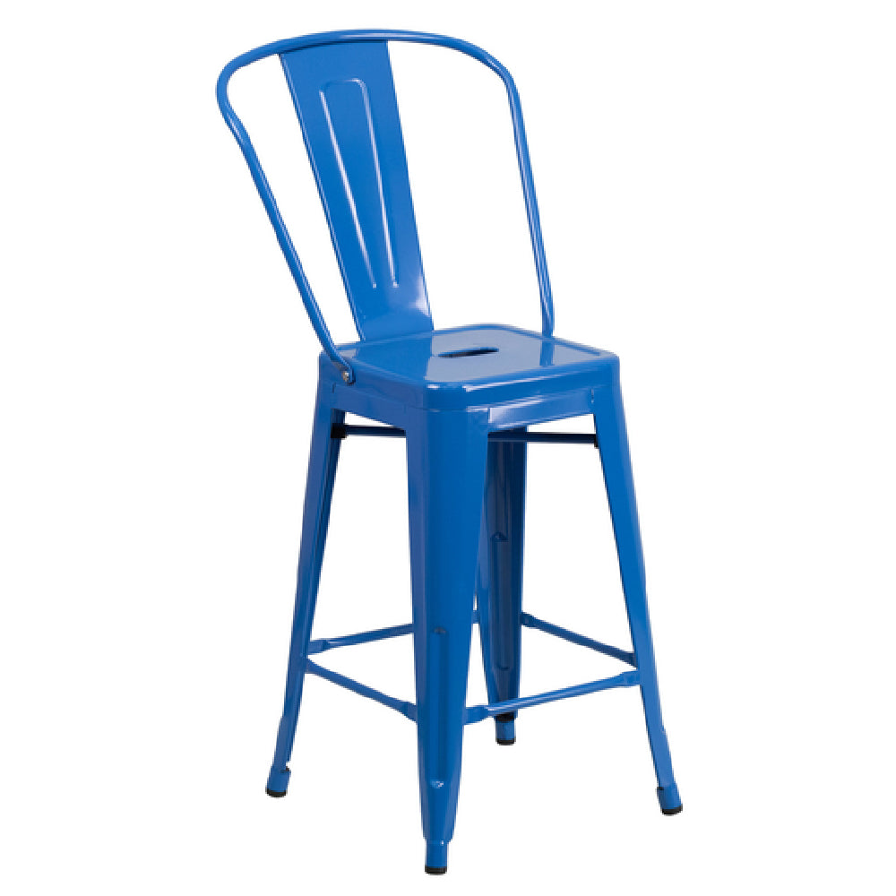 The Flash Furniture CH-31320-24GB-BL-GG Bar Stool is a robust seating solution with a remarkable 500 lb. weight capacity, making it suitable for a diverse range of users in both commercial and residential settings. Its counter height design, complemented by a curved back with a vertical slat, ensures ergonomic comfort and aesthetic appeal. The seat features a strategically placed drain hole, enhancing its durability and practicality for indoor and outdoor environments. Constructed from galvanized steel with a powder coat finish, this bar stool is both lightweight and resilient, offering long-lasting performance. A cross brace under the seat adds structural integrity, while the footrest provides additional comfort. The inclusion of plastic floor glides ensures that your floors remain scratch-free as the stool is moved. Available in a vibrant blue color, this bar stool requires assembly, but is designed to be straightforward to put together. It typically ships within 24 hours for in-stock items, ensuring quick delivery. This versatile stool adapts effortlessly to various settings, from bustling commercial spaces to relaxed residential areas, highlighting its adaptability and practical design.